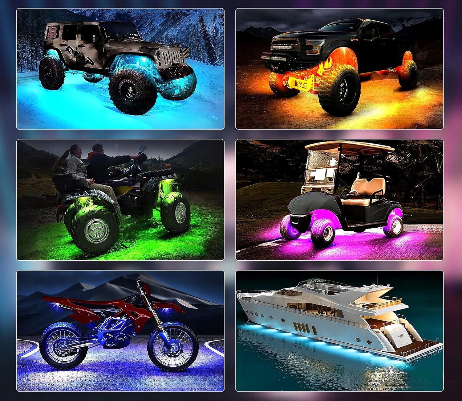 Zestaw oświetlenia podwozia jest idealny dla różnorodnych pojazdów, takich jak samochody osobowe, off-roadowe, SUV-y, motocykle, łodzie czy przyczepy. Można go zamontować pod pojazdem, w nadkolach, a także wewnątrz jako oświetlenie wnętrza.