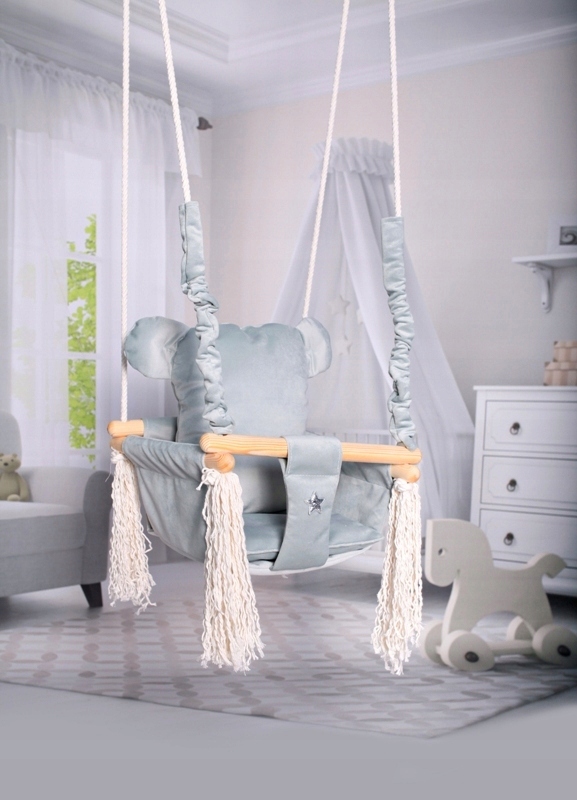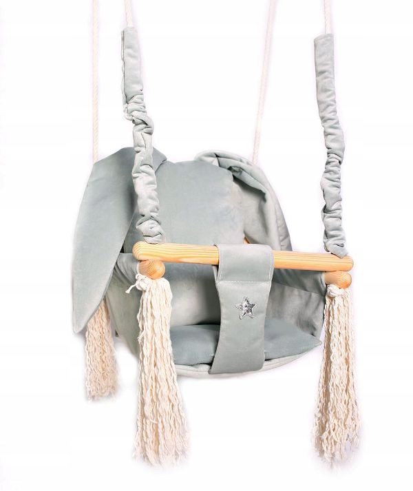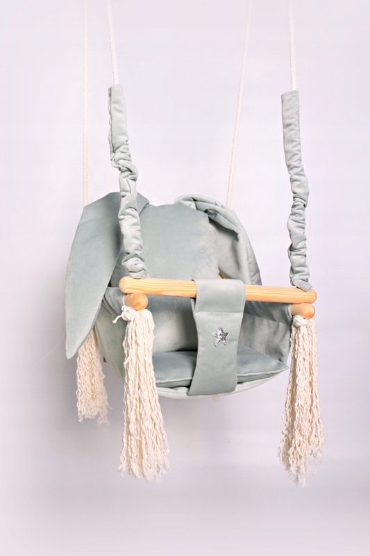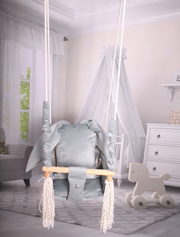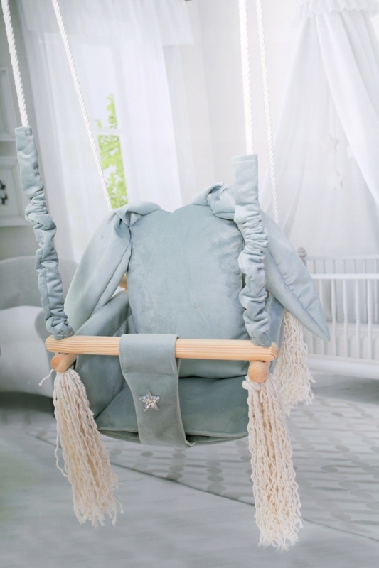 Huśtawka wykonana z delikatnego aksamitno pluszowego materiału, który jest bardzo miękki i delikatny w dotyku oraz bardzo wytrzymały.