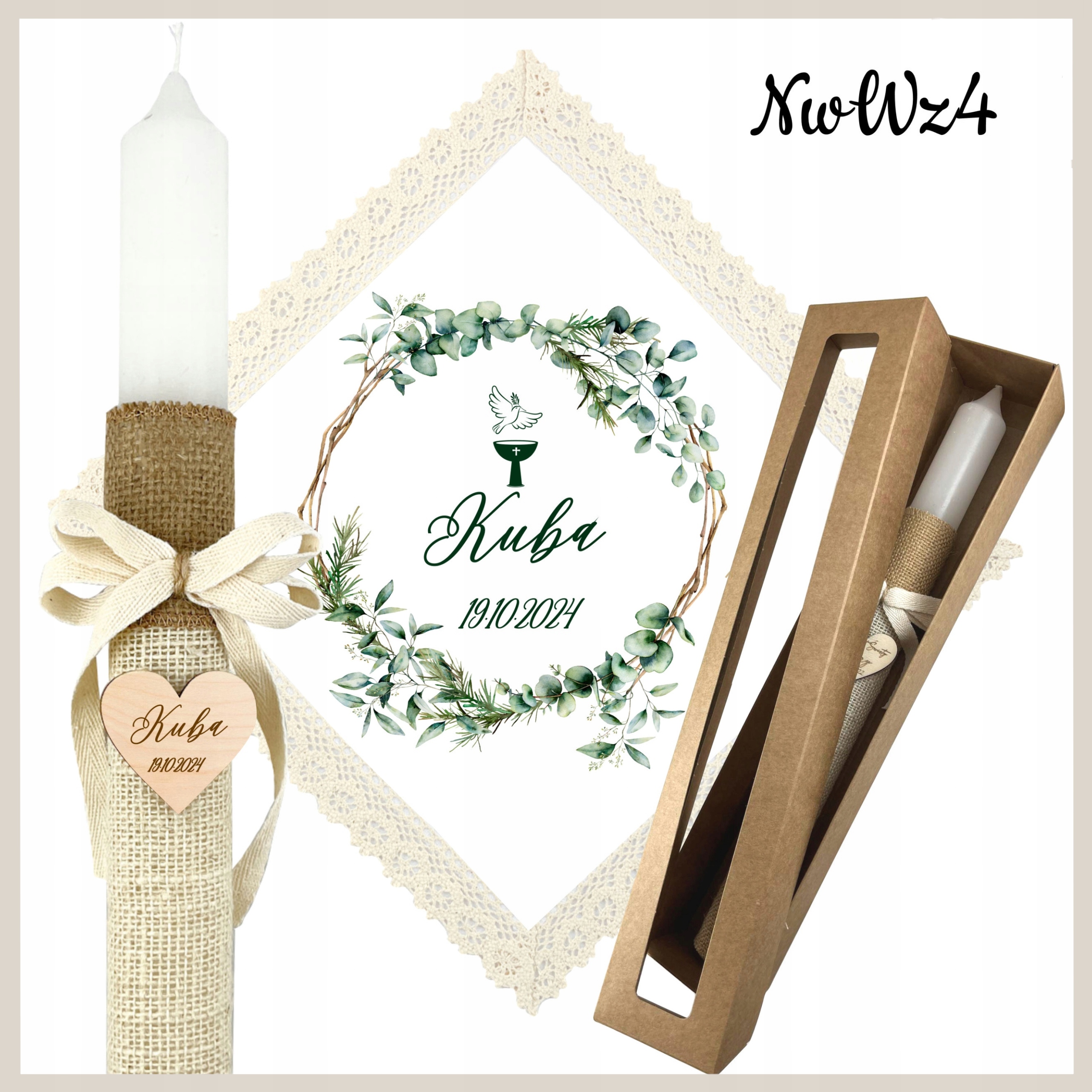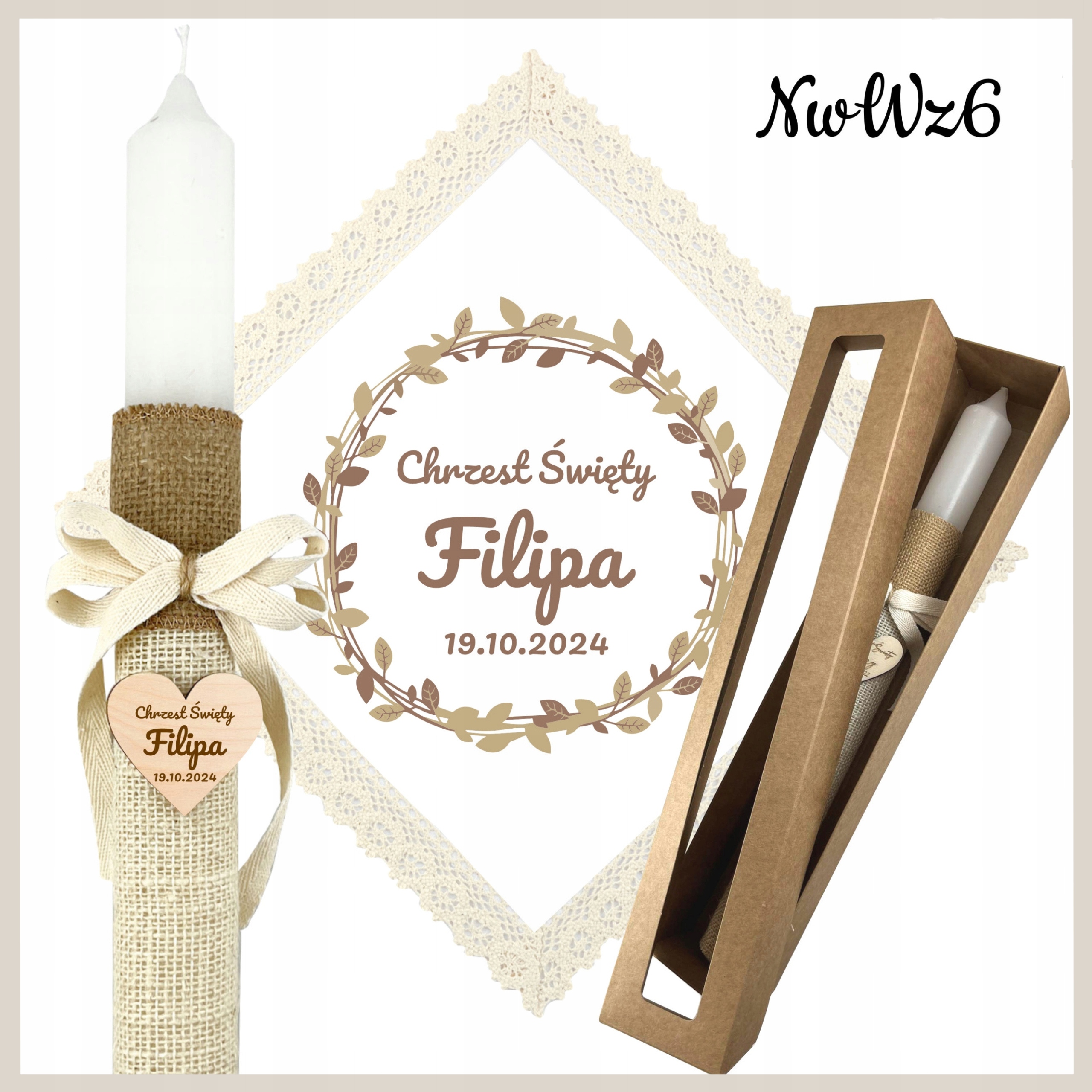 ✅ Świecy wykonanej z wysokiej jakości parafiny o długości 38cm. Ozdabiamy ją beżową i brązową jutą oraz kokardą i drewnianym grawerowanym serduszkiem.