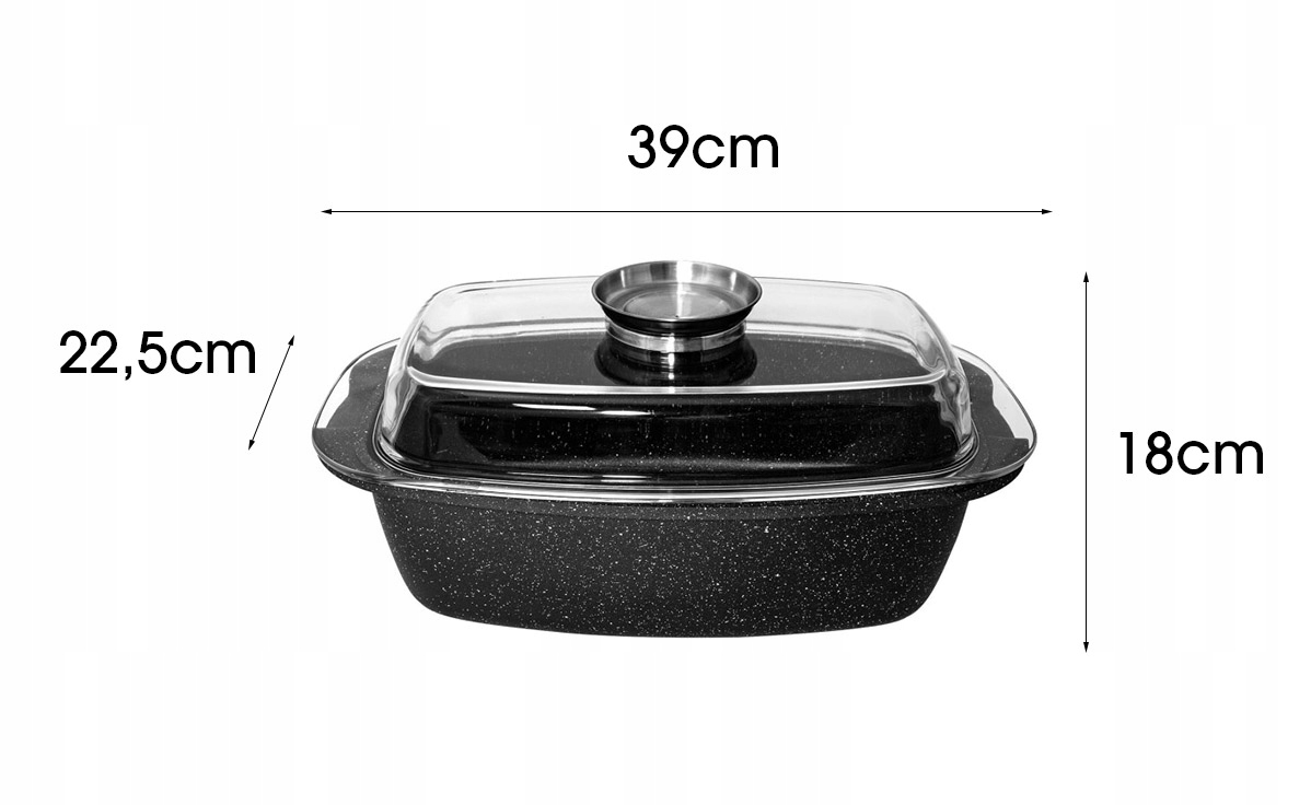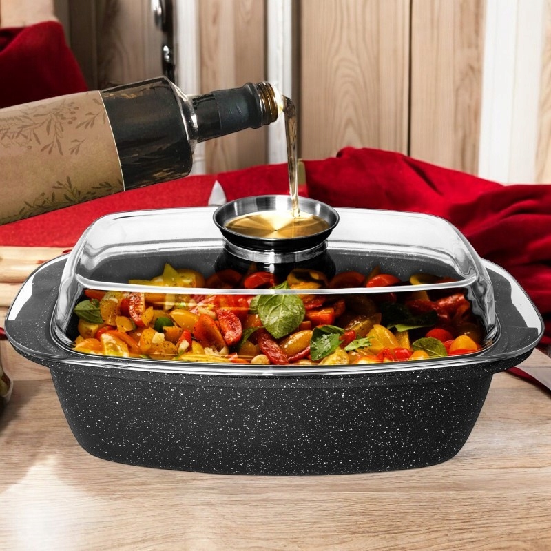 Brytfanna pokryta powłoką nieprzywierającą doskonale sprawdzi się do przyrządzania zdrowych, domowych potraw. Powłoka Non-Stick imitująca marmur chroni potrawy przed przywieraniem do brytfanny i przypalaniem, dodatkowo pozwalając na ich zdrowe przygotowanie, z małą ilością tłuszczu. Odpowiednio wyprofilowany kształt zapewnia wygodne użytkowanie naczynia. Pokrywa brytfanny została wykonana z żaroodpornego szkła. Brytfanna sprawdzi się zarówno przy potrawach mięsnych jak i warzywnych - zachowując ich wartości odżywcze. Dzięki niej mięso pozostanie soczyste, a warzywa nie ulegną wysuszeniu.