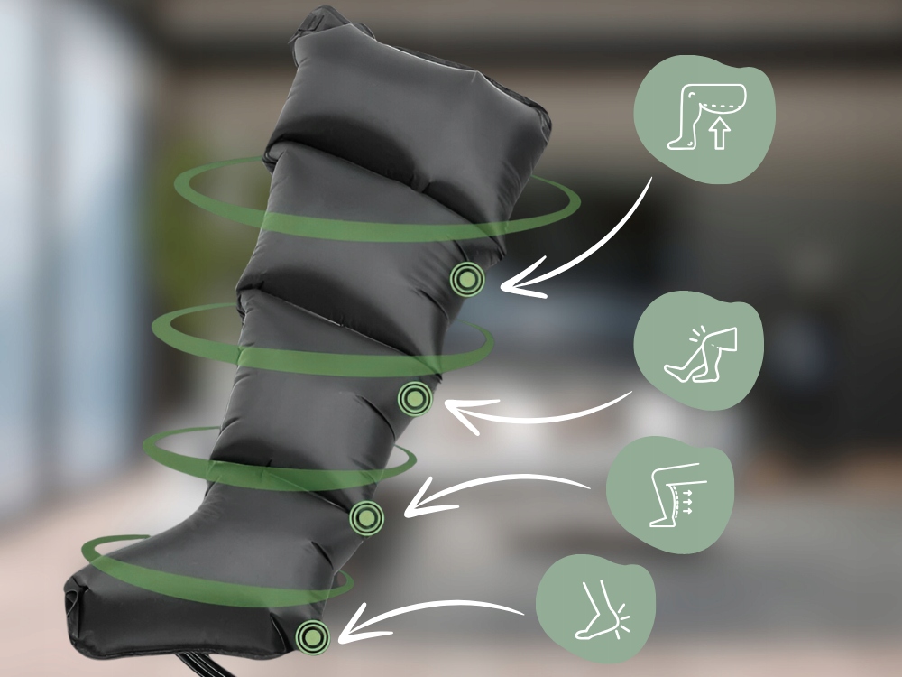 A: Wstępny masaż uciskowy – delikatne przygotowanie do pełnego drenażu. Każda z 4 komór mankietów napełnia się kolejno, co przygotowuje tkanki do dalszych etapów masażu.