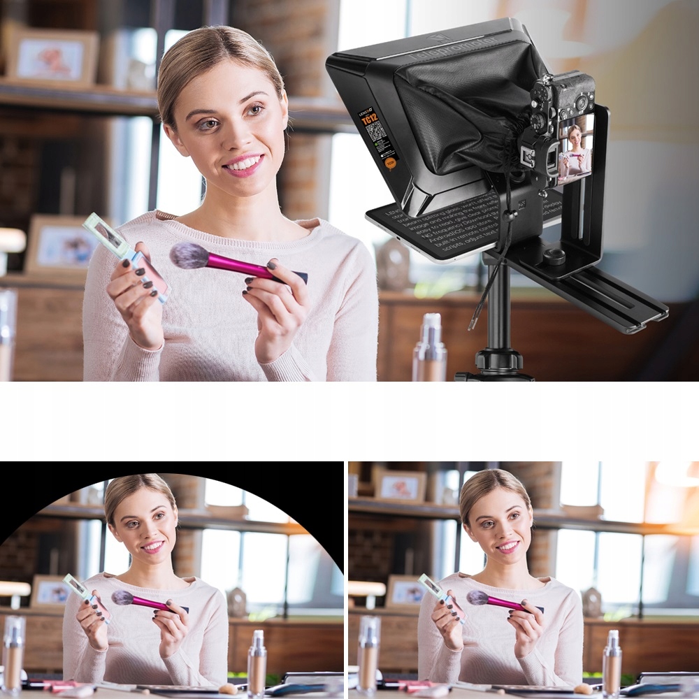 ⭐Do nagrywania materiałów aparatem SLR / DSLR, kamerą internetową, kamerą wideo z mocowaniem 1/4". Wielkość obiektywu kamery/lustrzanki nie jest ograniczeniem, gdyż teleprompter ma uniwersalne mocowanie na specjalną gumkę uciskową, która umożliwia dokładne i szczelne dopasowanie do obiektywu