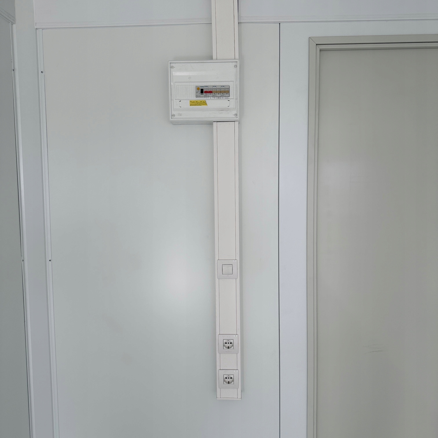 INSTALACJA ELEKTRYCZNA (CONTAINEX BASIC Line):Podłączenie za pomocą puszki rozgałęźnej (230V / 3 polig, 32A), instalacja natynkowa – 1 szt.Natynkowa skrzynka bezpiecznikowa 1 rzędowa -1 szt.Włącznik – 1 szt.Lampa LED – 1 szt.Gniazdko wewnętrzne 1x230V – 2 szt.Włączniki światła i gniazdka elektryczne zamontowane w kanale kablowym.