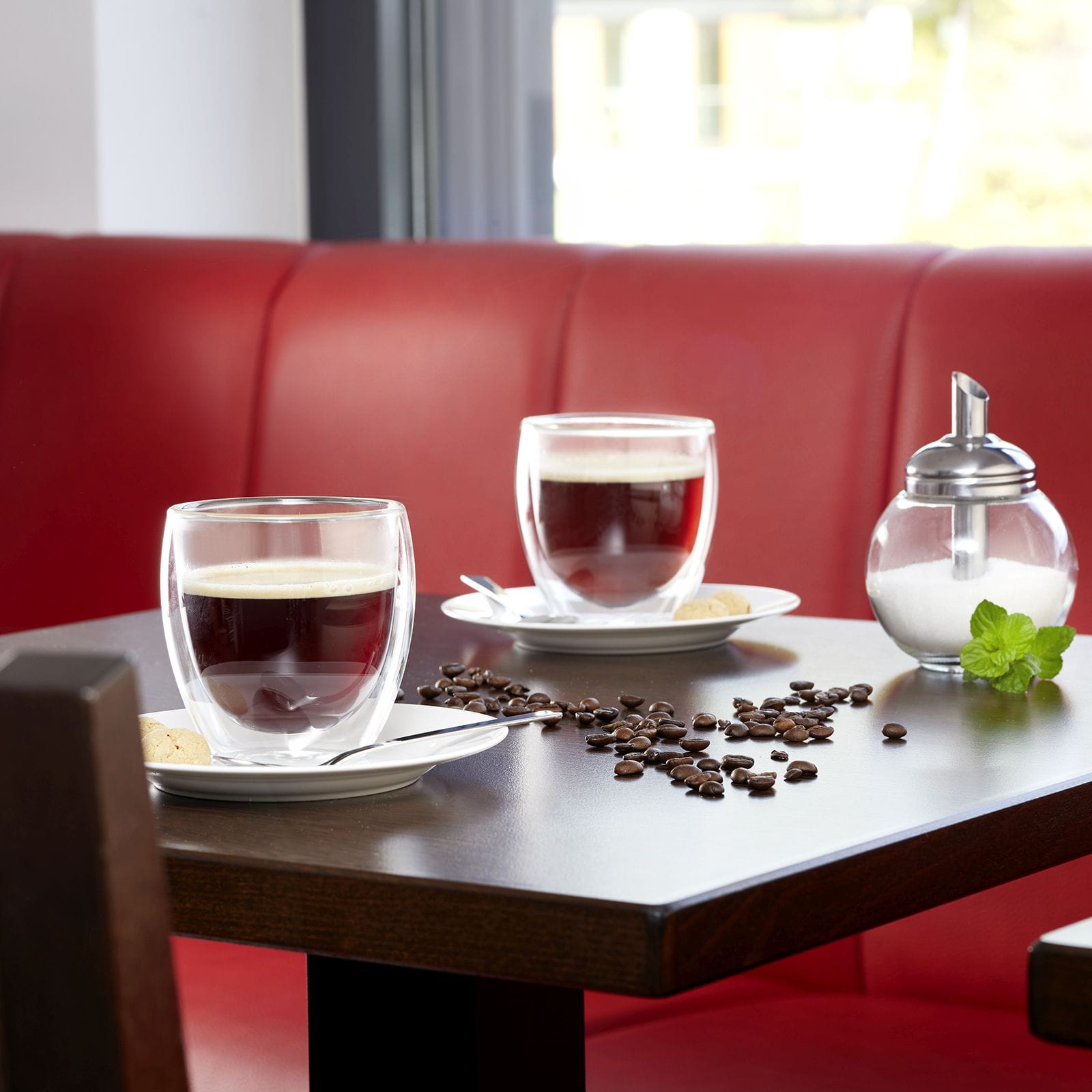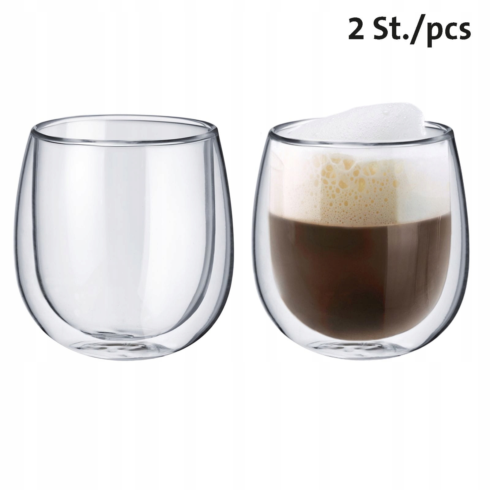 Zestaw 2 dwuściennych szklanek do kawy z żaroodpornego szkła borokrzemianowego firmy Westmark, pojemność 250 ml.