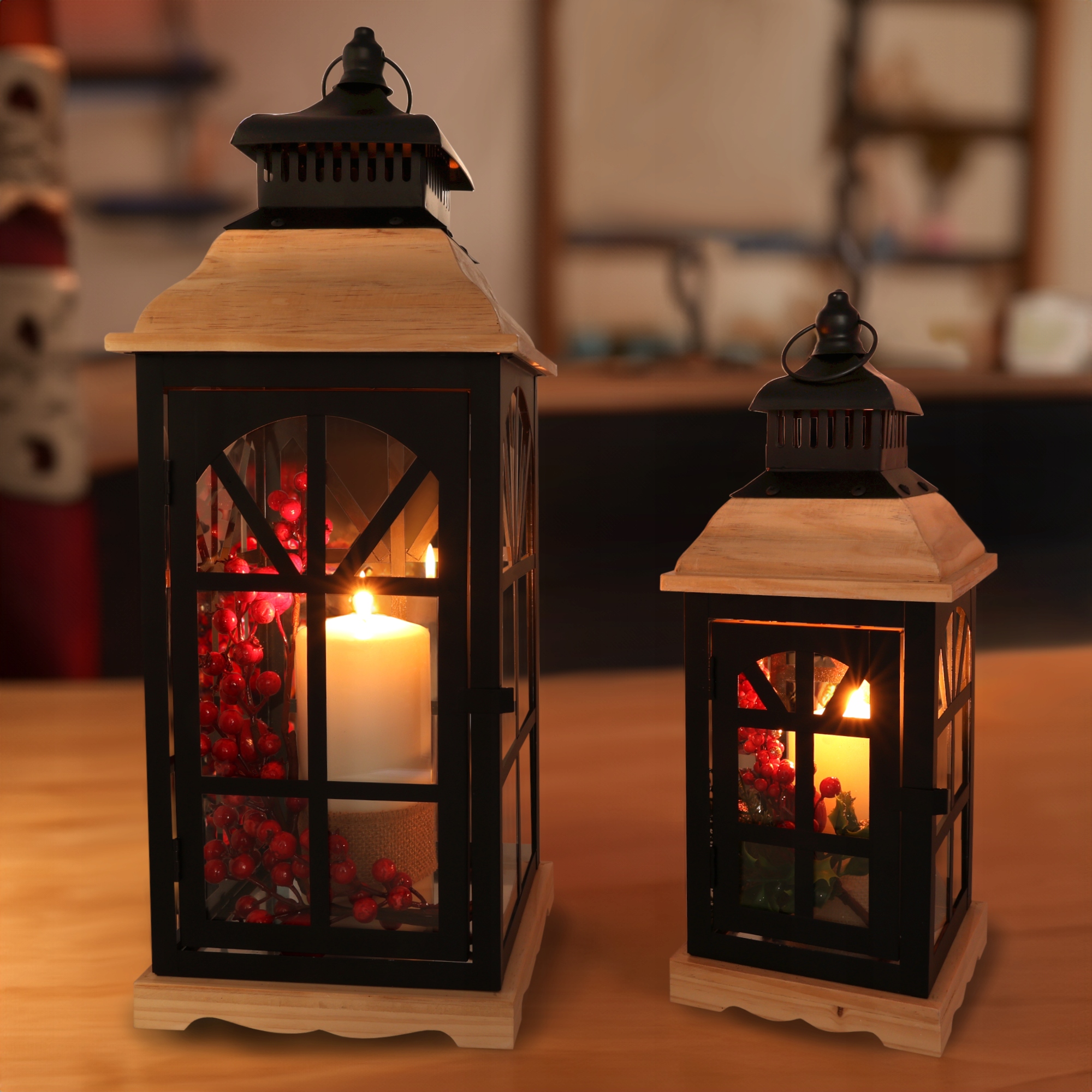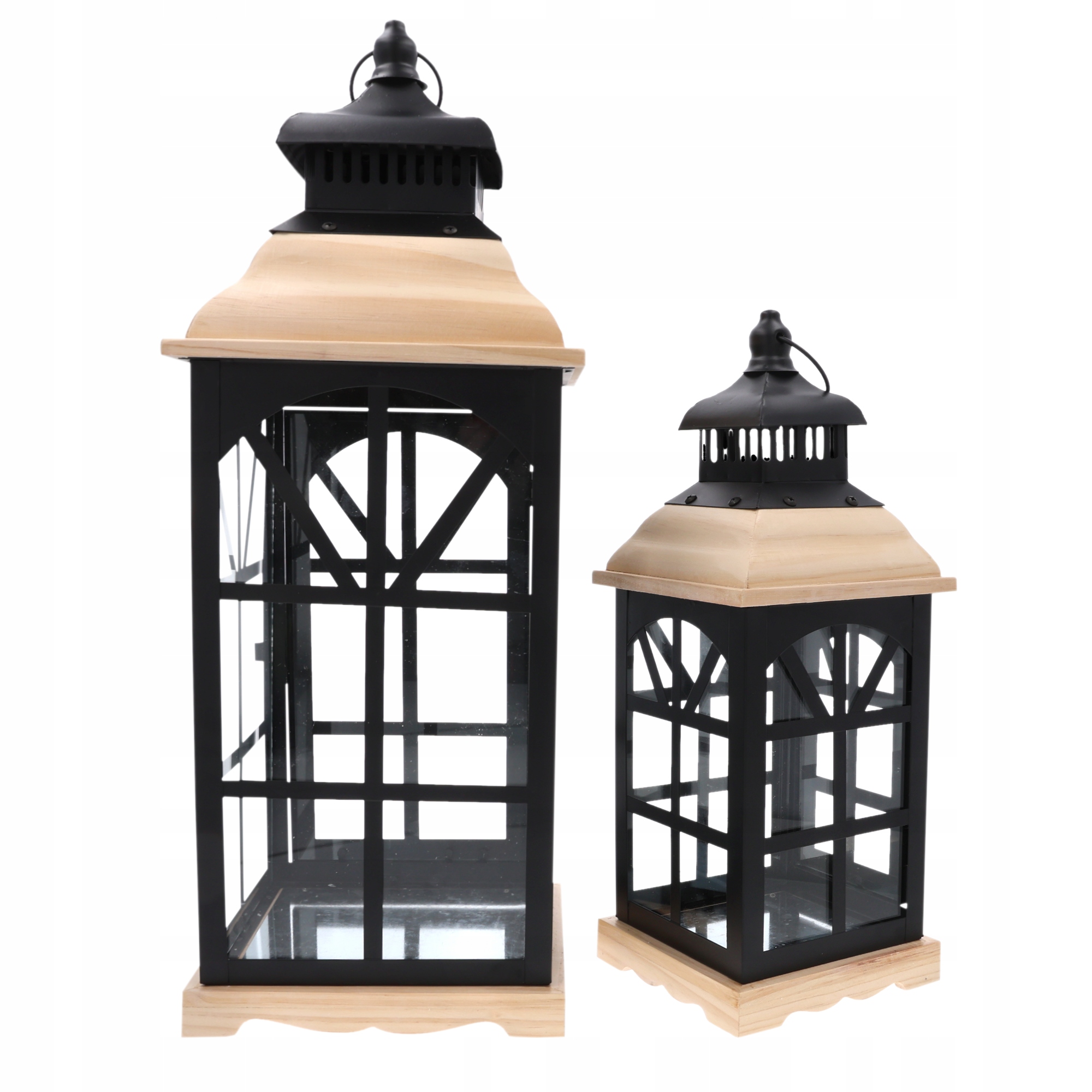 Nowoczesne lampiony wykonane z metalu, szkła i drewna.