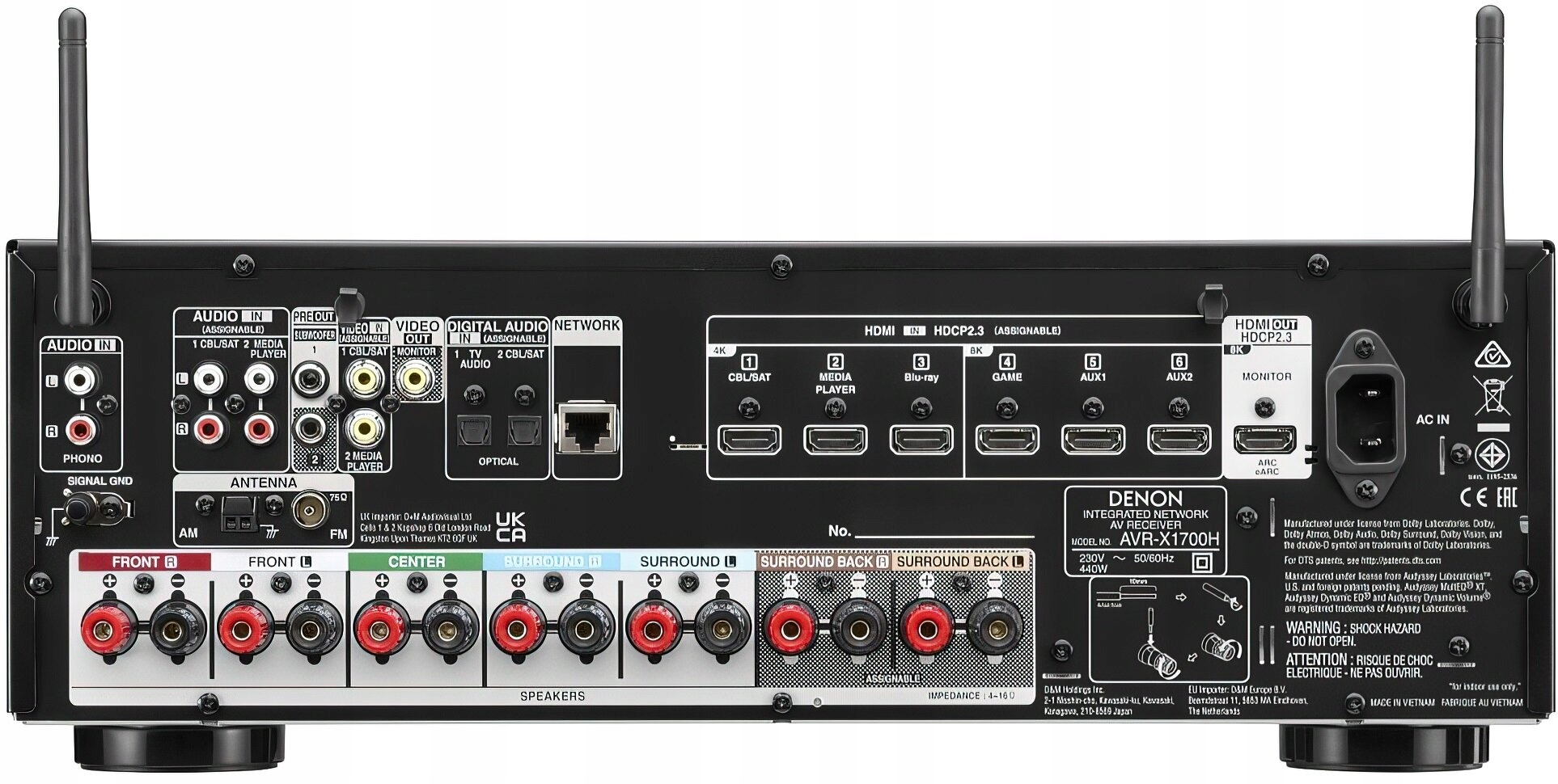 Potężny amplituner DENON AVR-X1700H to urządzenie, które zapewnia możliwość obsługi standardu audio 7.2, przy czym jego moc to aż 80 W na kanał, dzięki czemu jego posiadacz ma dostęp do solidnego i mocnego brzmienia w każdej z dostępnych częstotliwości. Dodatkowo sprzęt ten jest kompatybilny ze standardem Dolby Atmos, a także z technologią Dolby Atmos Height Virtualization Technology, wraz z DTS:X. Dzięki temu posiadacz tego sprzętu będzie mógł poczuć się jak w prawdziwym kinie.