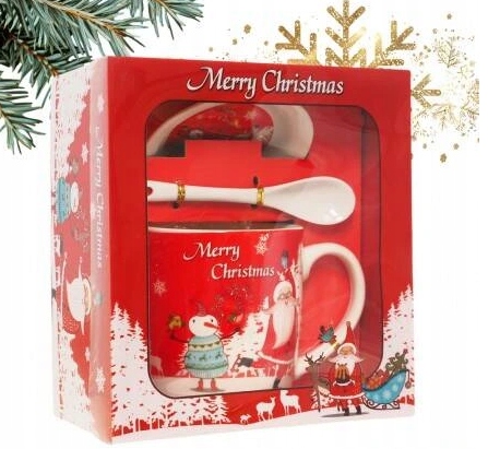 Kubek ceramiczny z motywem świątecznym ze spodkiem i łyżeczką. Produkt przeznaczony do ręcznego mycia. Zestawu zapakowany w ozdobne kartonowe pudełko. Wymiary opakowania: 18x 16,5x 10cm.
