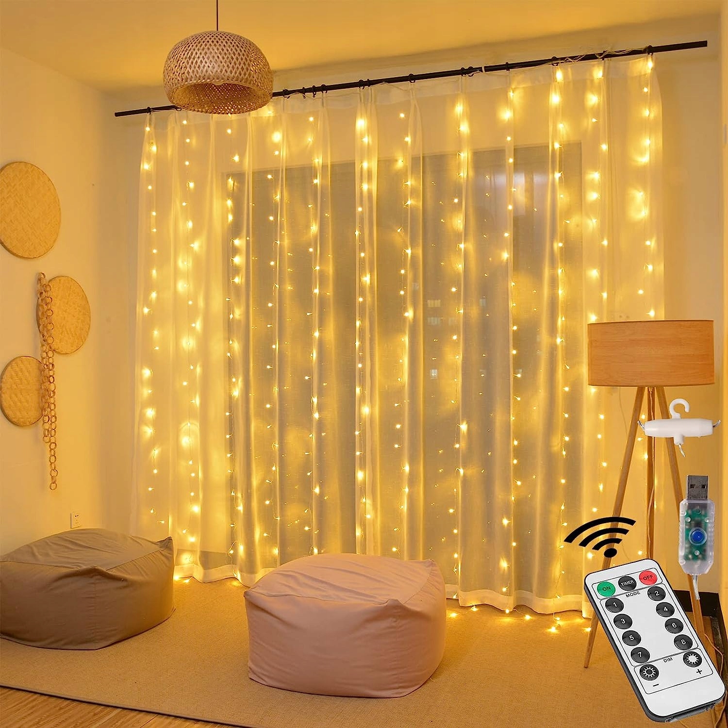 Kurtyna świetlna jest zaopatrzona w bezprzewodowy pilot zdalnego sterowania, dlatego od teraz nie będziesz musiał podchodzić do lampek LED, aby je ustawić. Dzięki pilotowi obsługa kurtyny będzie bardzo komfortowa i przyjemna.