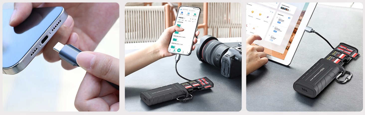 ✅ Czytnik kart pamięci wraz z wytrzymałą obudową to świetne rozwiązanie 2w1 dla fotografów, kamerzystów i innych osób, które potrzebują szybkiego i wygodnego dostępu do wielu kart pamięci.