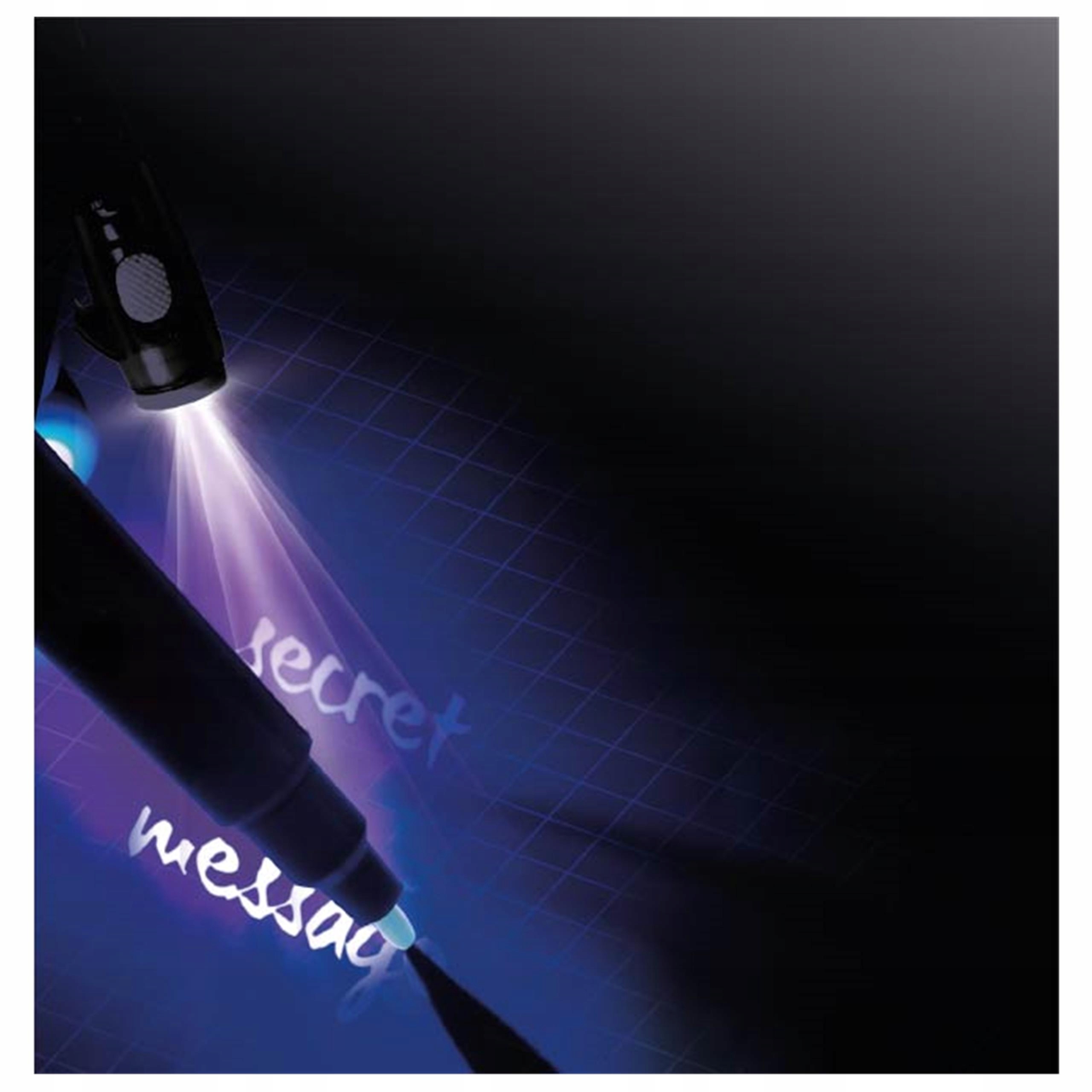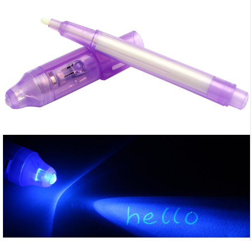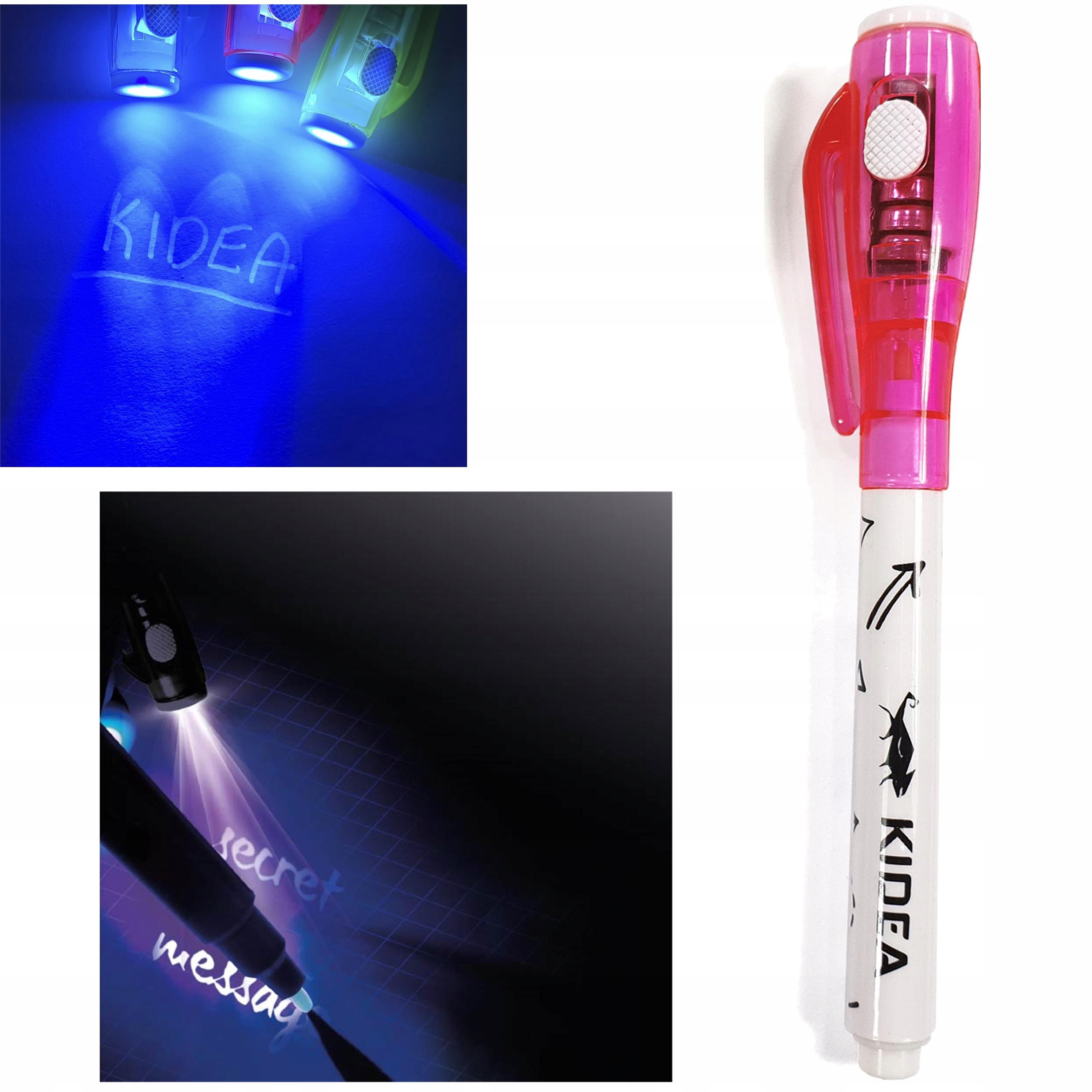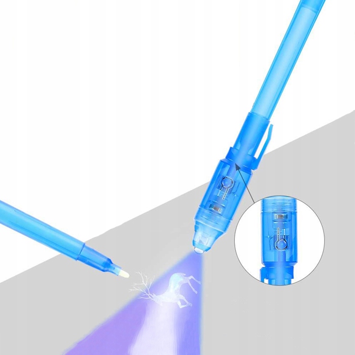 Magiczny długopis z lampką LED posiada tusz widoczny tylko w świetle wbudowanej latarki UV. Tusz podczas pisania jest niewidoczny, aby przeczytać niewidzialną wiadomość należy podświetlić kartkę. To świetna zabawa w ukrywanie informacji przed niepożądanymi osobami i idealny sposób by strzec swoich sekretów. Zasilanie na baterie. Dostępne 3 kolory: zielony, fioletowy lub niebieski.
