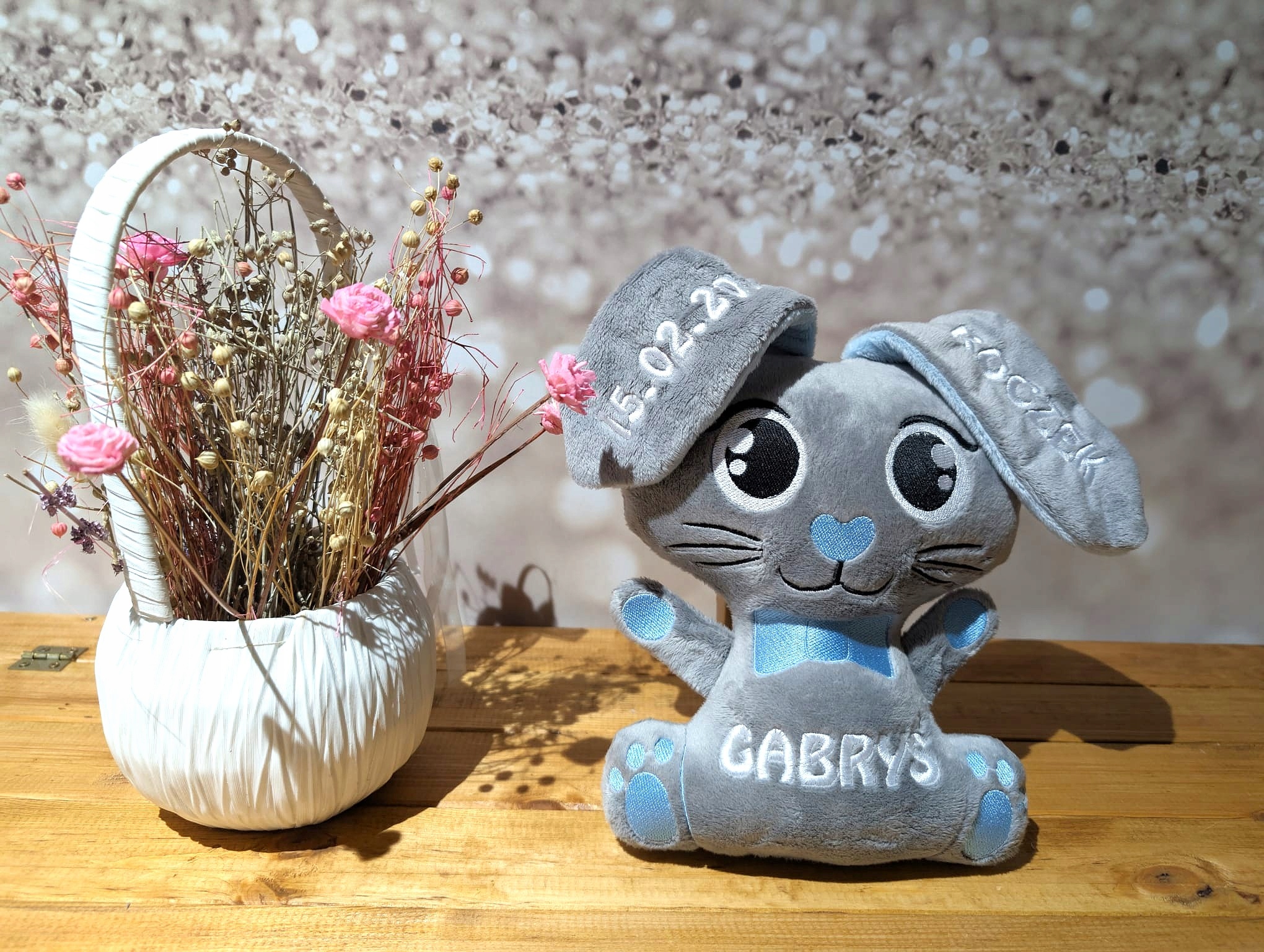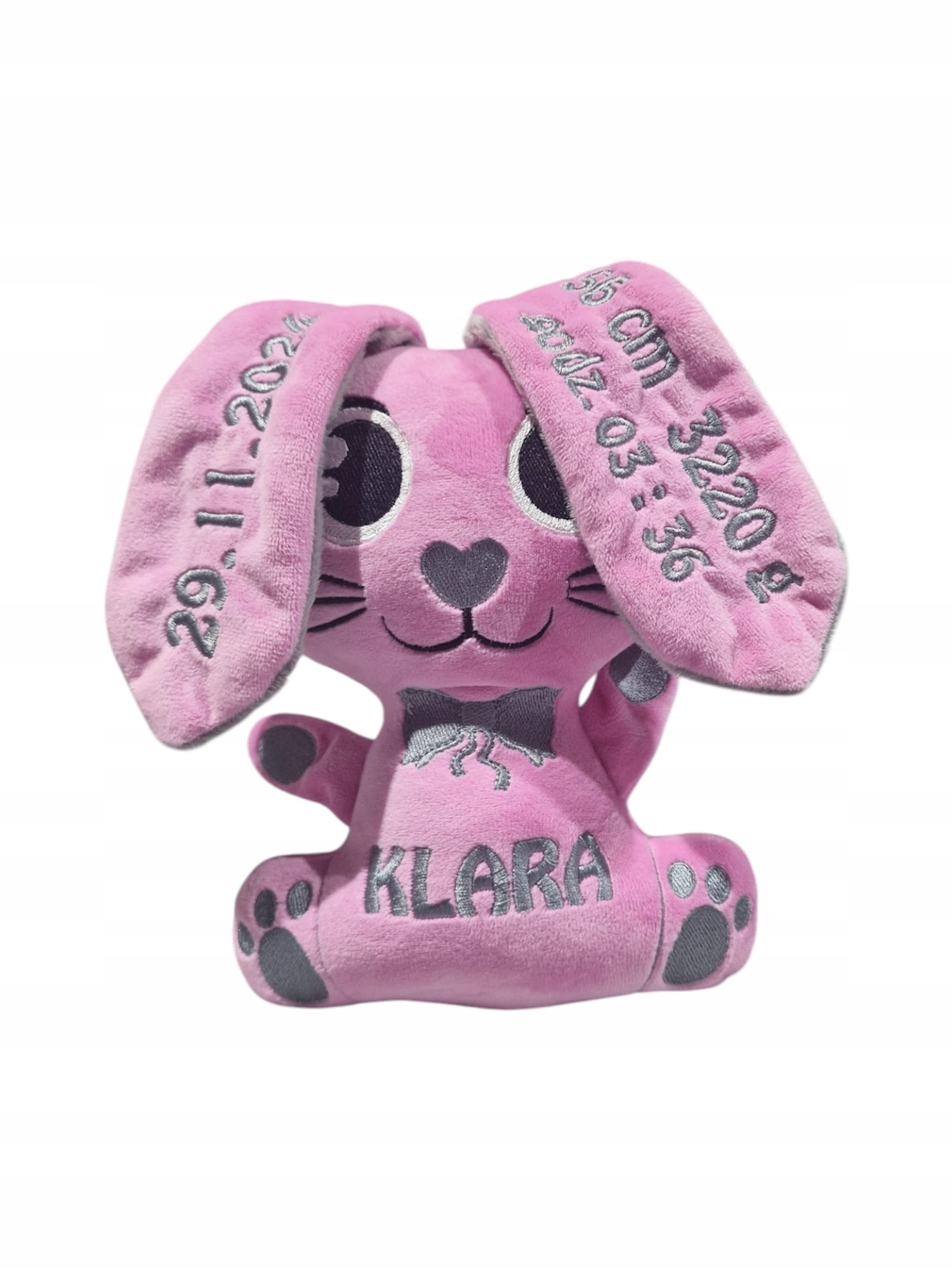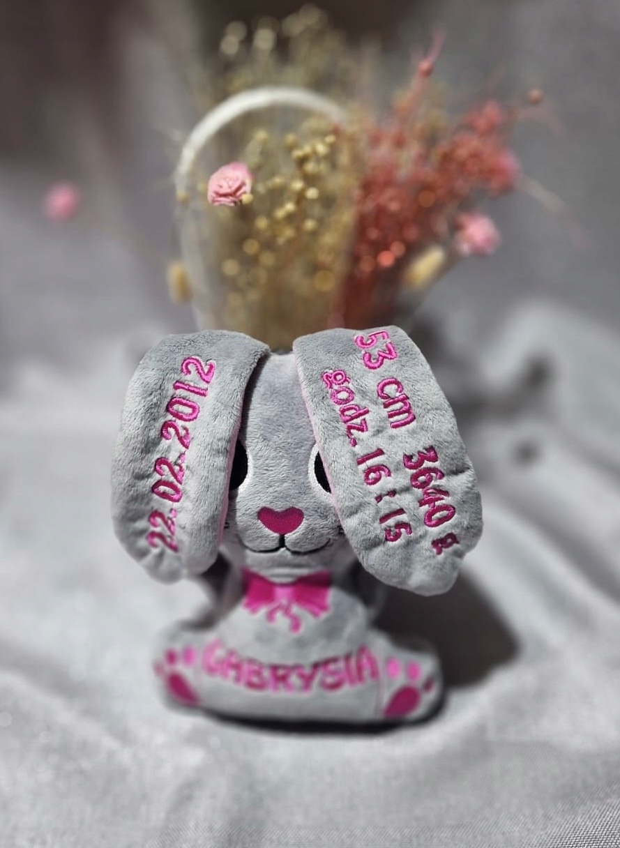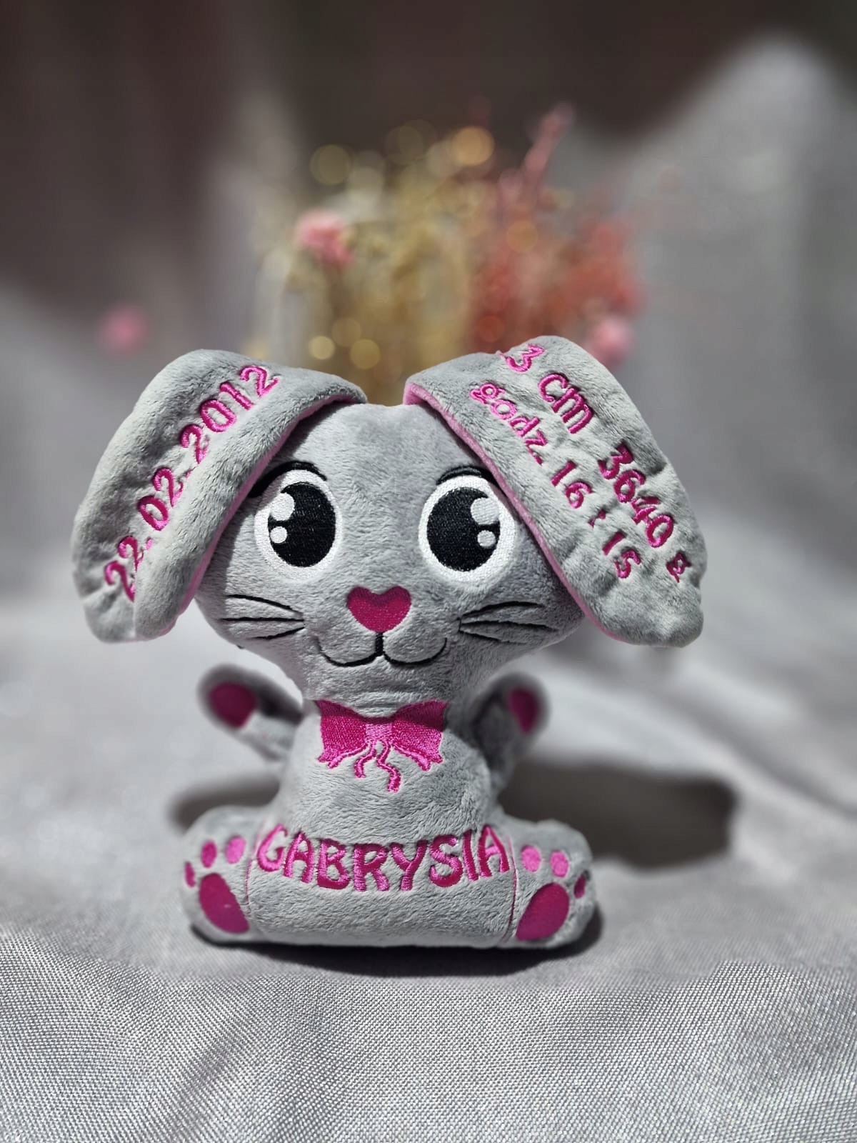 Nasz spersonalizowany króliczek będzie niezapomnianą pamiątką i oryginalnym prezentem na narodziny dziecka, roczek, chrzciny, lub inne okazje.