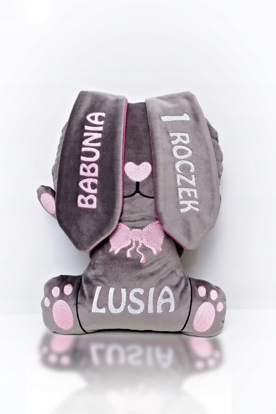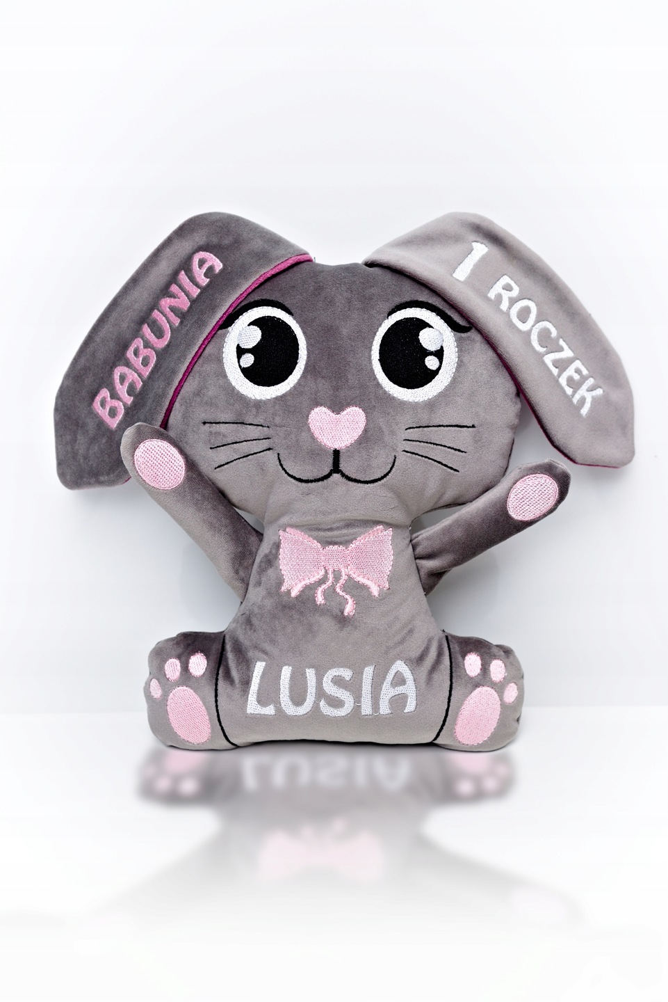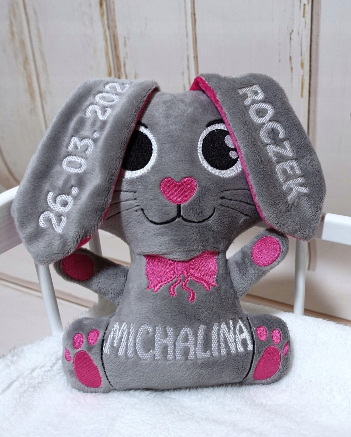 Nasz spersonalizowany króliczek będzie niezapomnianą pamiątką i oryginalnym prezentem na narodziny dziecka, roczek, chrzciny, lub inne okazje.