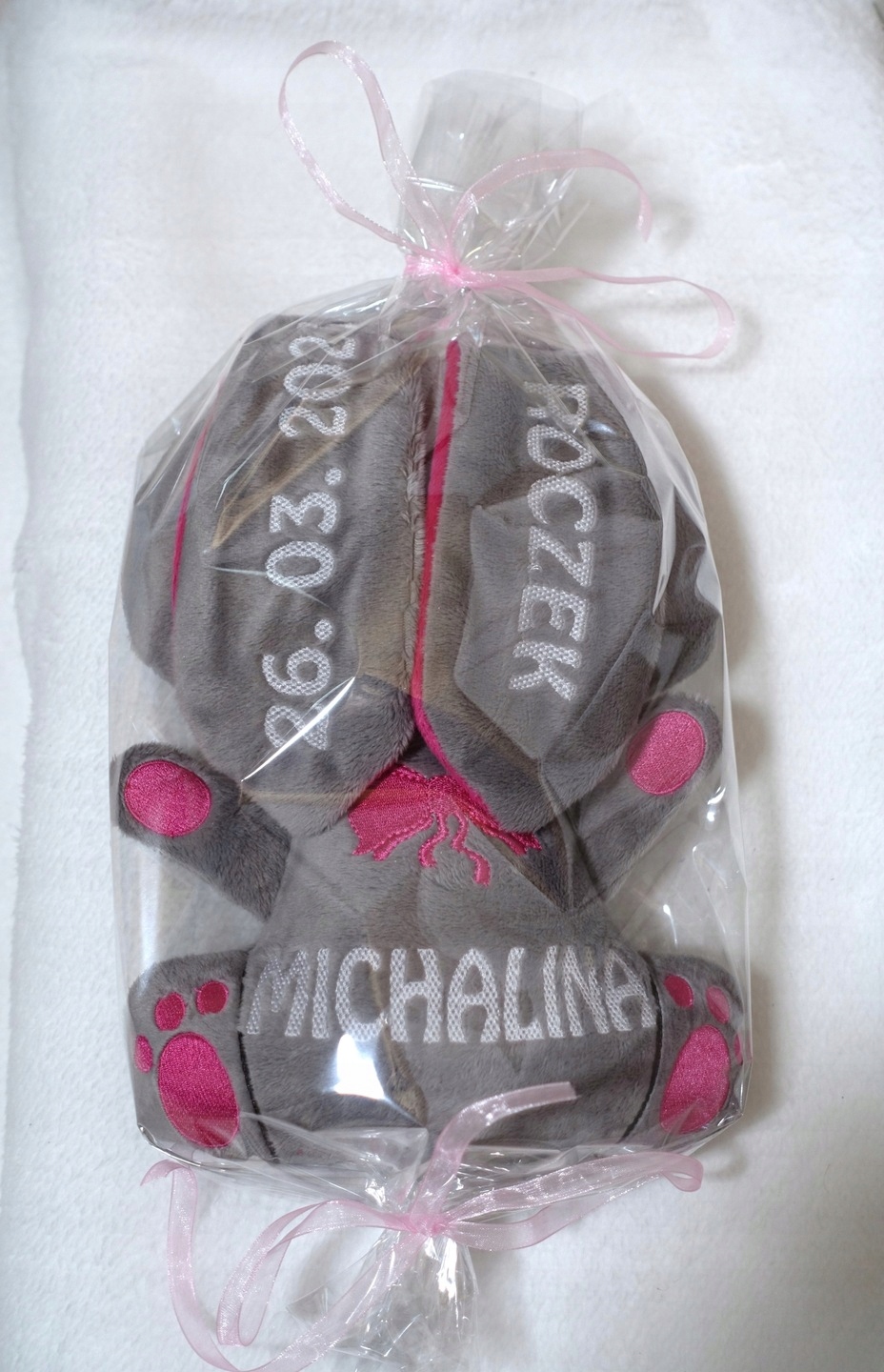 Na indywidualne życzenie możemy wyhaftować dowolna krótką dedykację, która zostanie umieszczona na uszkach.