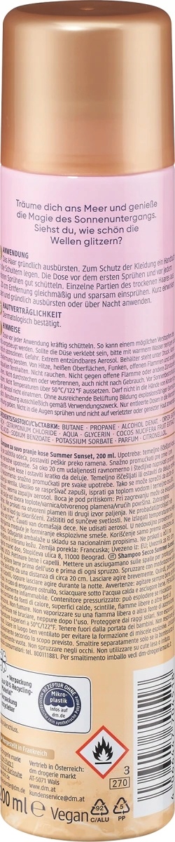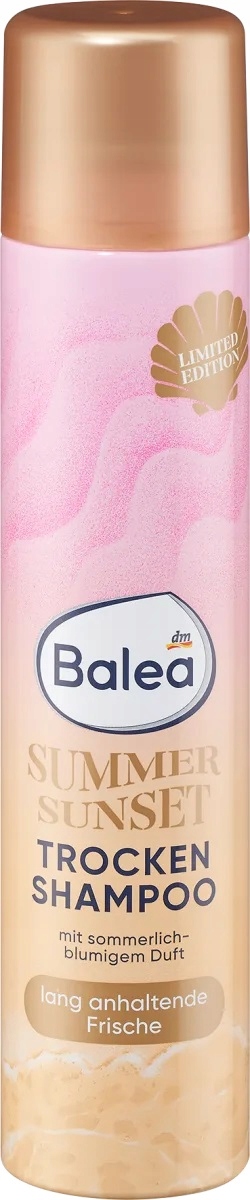 Suchy szampon Balea Summer Sunset o letnim, kwiatowym zapachu odświeża włosy w ciągu kilku sekund. Formuła zapewnia nowy chwyt i obszerną pełnię. Idealny również do stosowania na noc. Receptura bez mikroplastików i rozpuszczalnych w wodzie polimerów syntetycznych.
