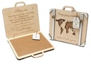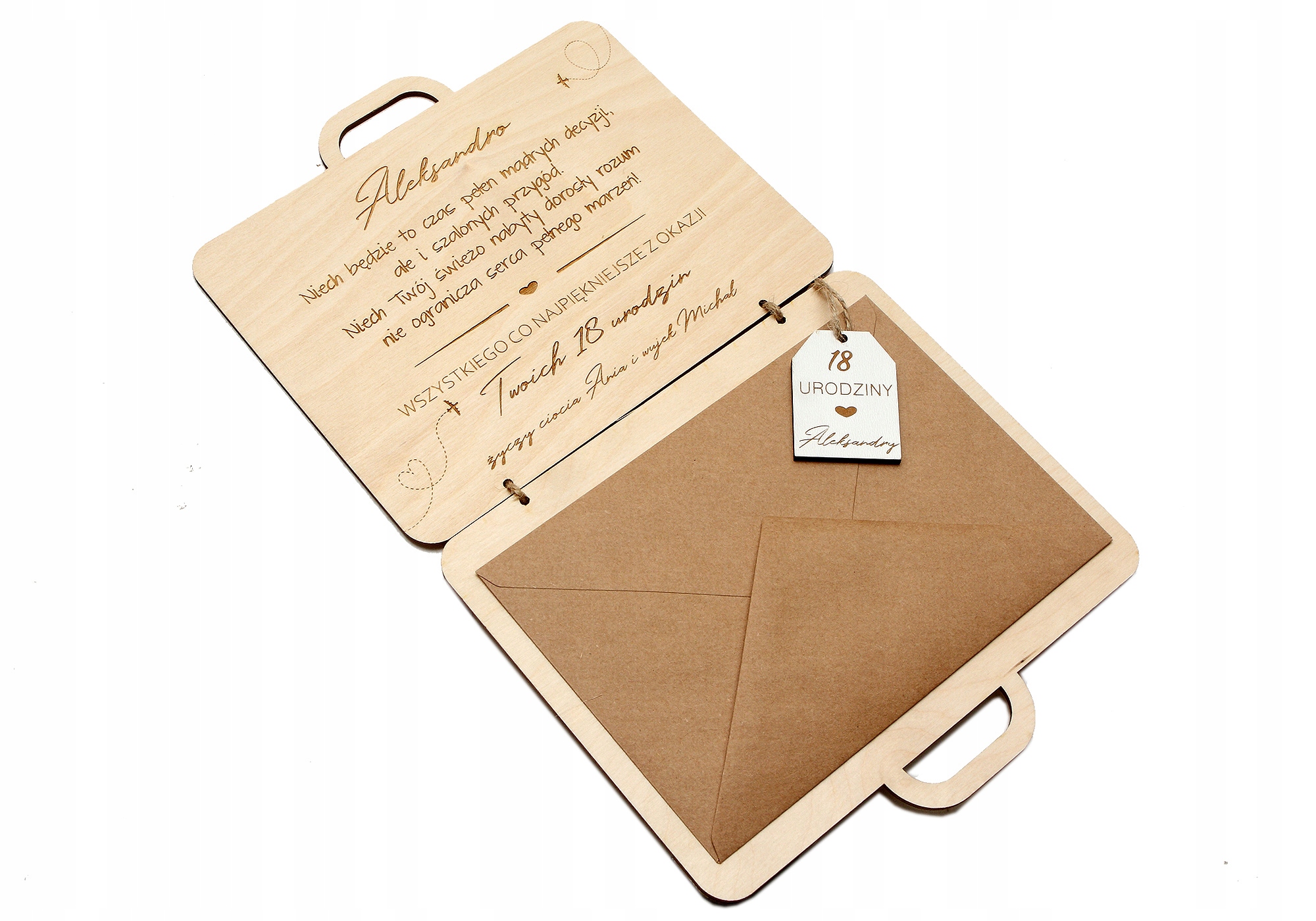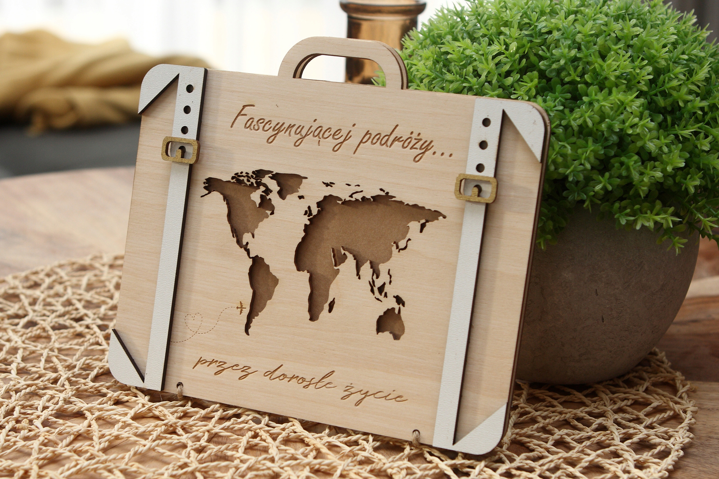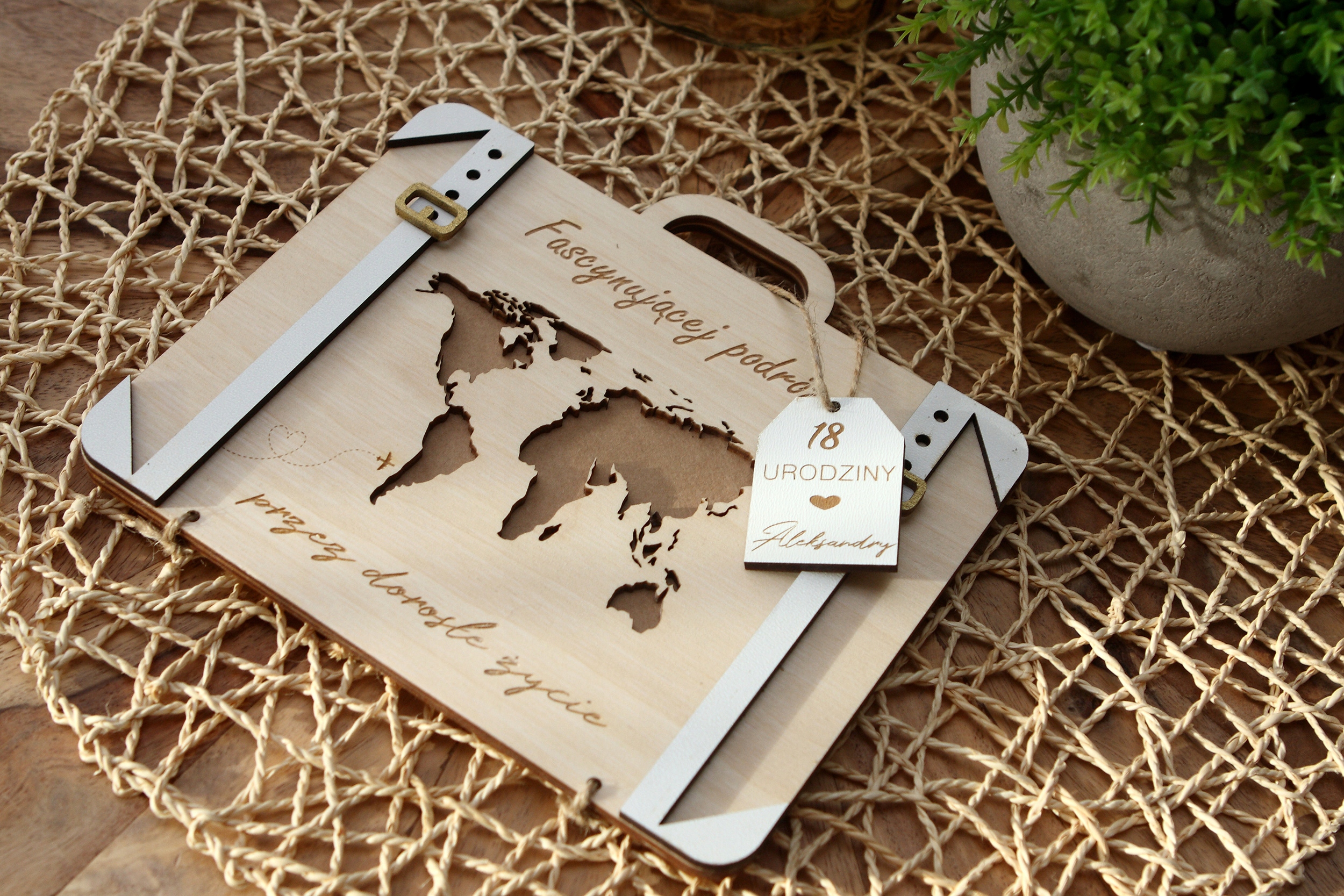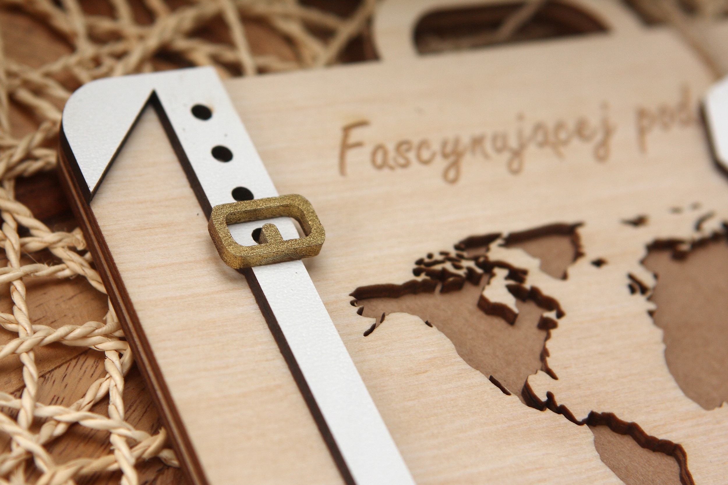 Drewniana kartka w kształcie walizki podróżnej to wyjątkowy i oryginalny prezent , który wyróżnia się szczególnymi cechami: