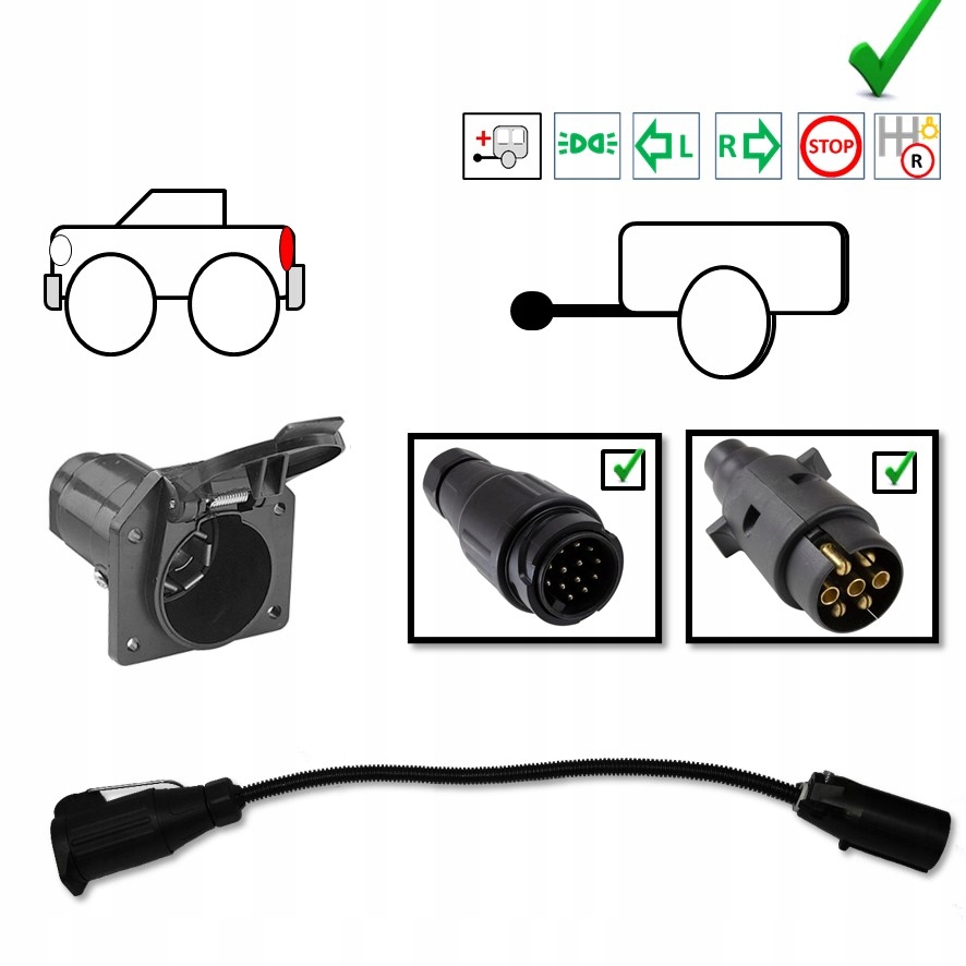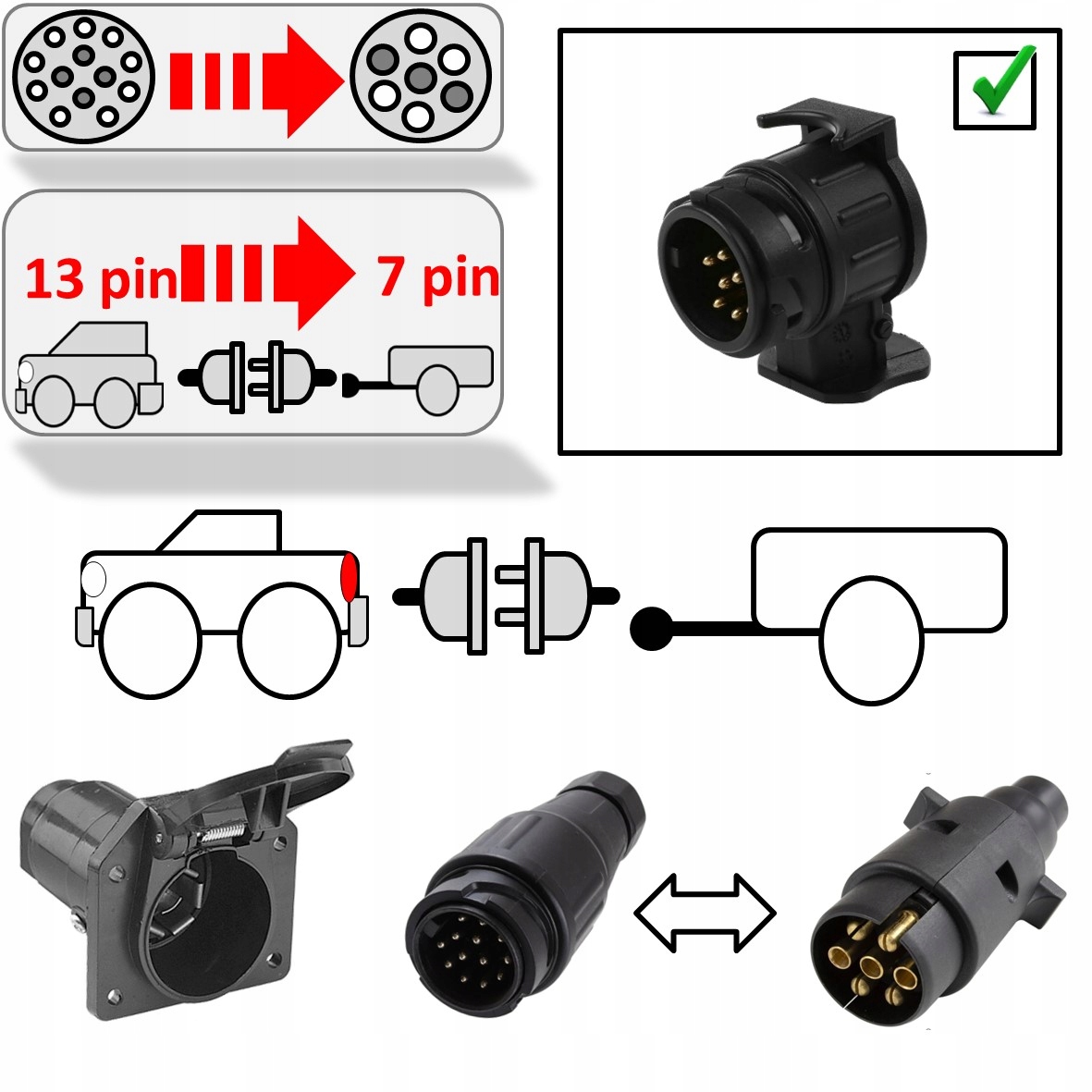 Nasz uniwersalny adapter pozwala podłączyć standardową europejską przyczepę lub listwę świetlną z wtykiem 13 pin do gniazda amerykańskiego 7 pin.