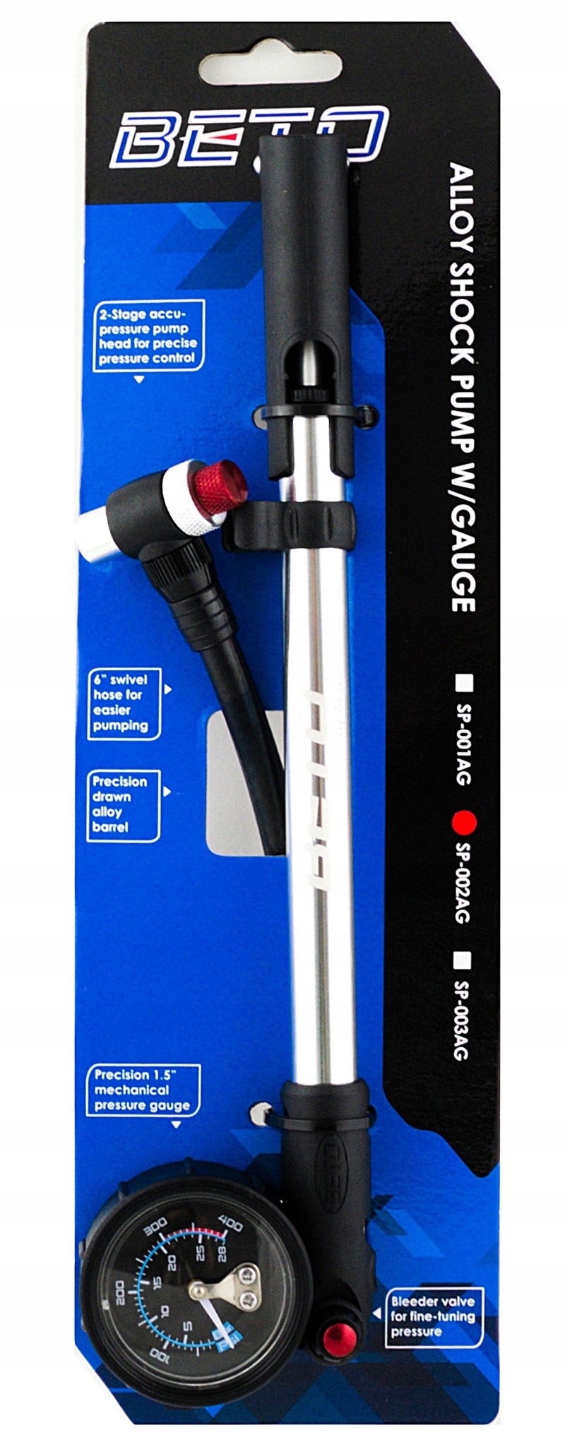 Ciśnienie do 400 PSI (28 bar), metalowa głowica na zawór AV (samochodowy/Schrader), przycisk który umożliwia łatwe upuszczenie ciśnienia, precyzyjny manometer o średnicy 1,5” (ok. 4 cm) klasy przemysłowej. Te cechy sprawiają że pompka BETO to produkt na którym można polegać.