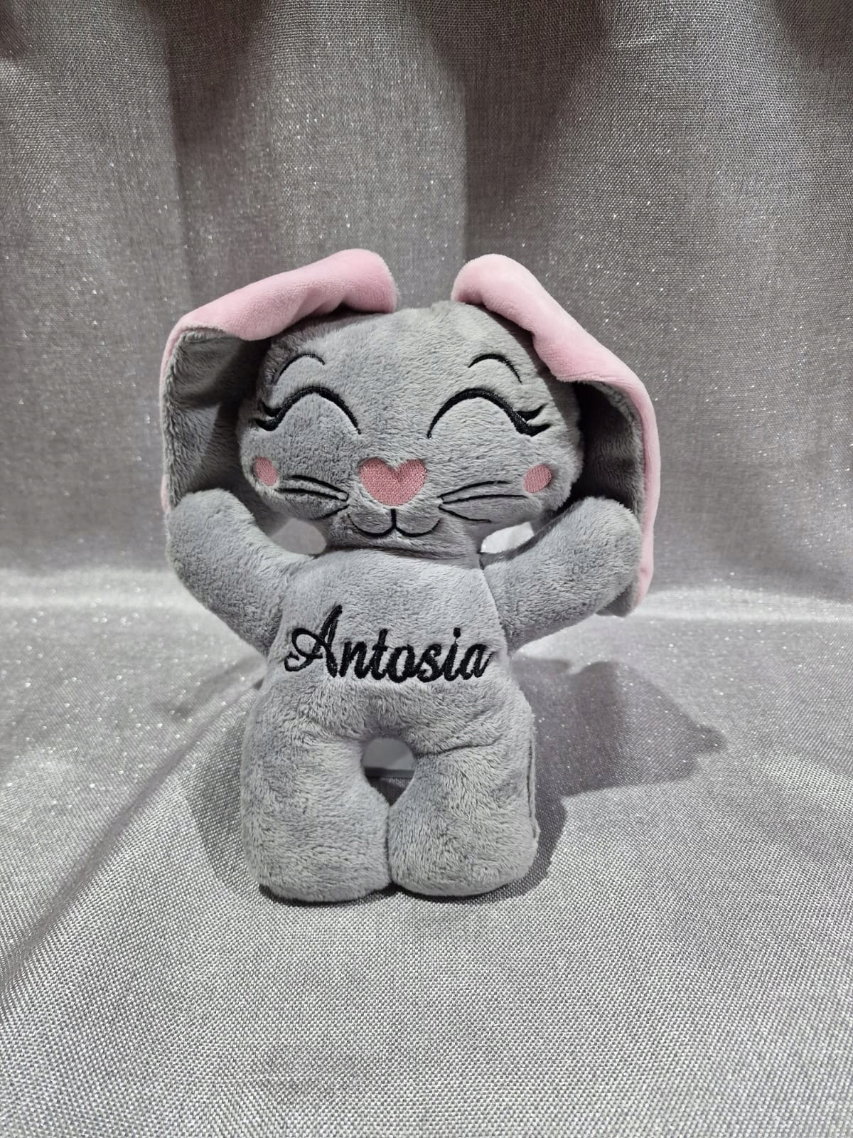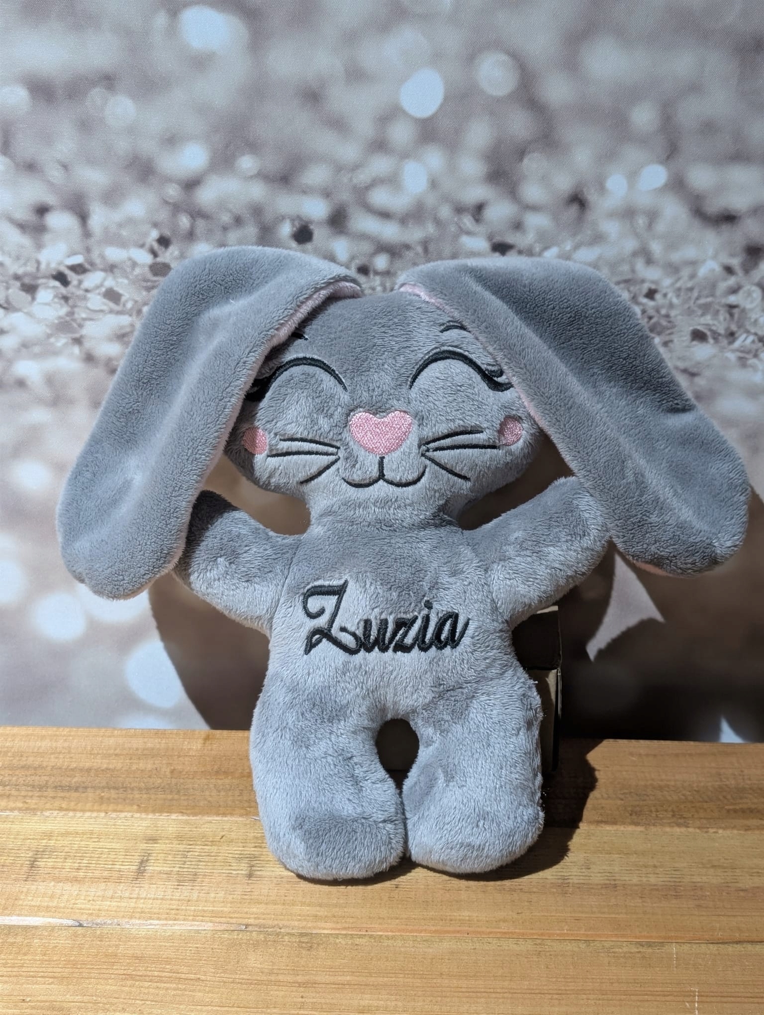 Króliczek ma na sobie haftowane imię dziecka, co nadaje mu wyjątkowego charakteru i sprawia, że jest on jedyny w swoim rodzaju. Personalizacja sprawia, że staje się niezapomnianym prezentem – to upominek, który pozostanie z dzieckiem na długie lata jako cenna pamiątka z dzieciństwa. Taki spersonalizowany króliczek będzie idealnym wyborem na chrzest, narodziny, urodziny lub każdą inną wyjątkową okazję.