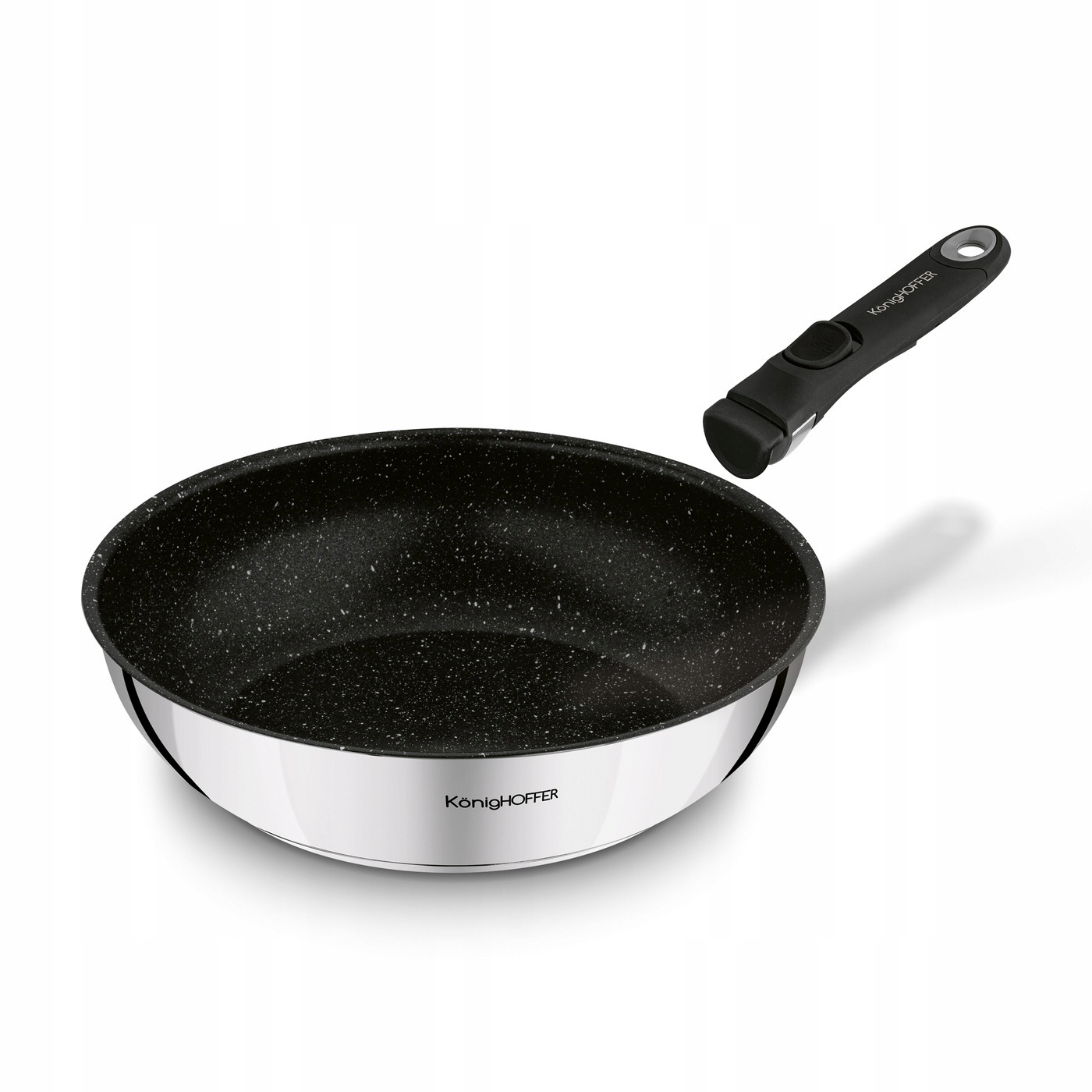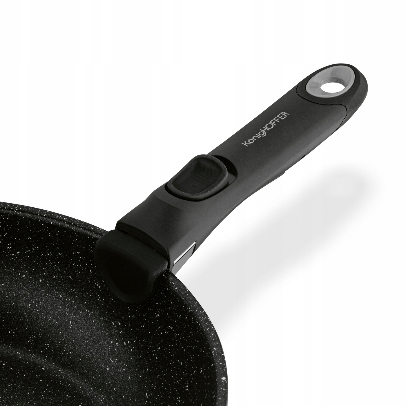 Skład zestawu: - patelnia 20 cm, - patelnia 24 cm, - patelnia 28 cm, - odpinana rączka