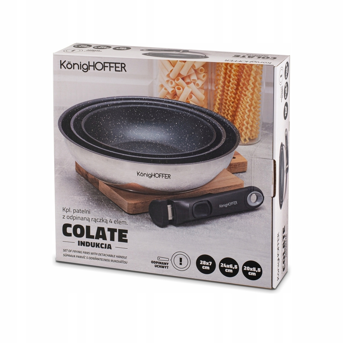 Komplet patelni głębokich non-stick z powłoką typu stone Konighoffer Colate 20/24/28 cm wykonany jest ze stali nierdzewnej. Dzięki temu jest świetnie wyważony i poręczny. Podwyższoną trwałość zapewnia mu powłoka redukująca przywieranie jedzenia. Jej wysoka jakość, twardość oraz struktura zostały opracowane z myślą o wieloletnim smażeniu. Energooszczędność daje specjalna budowa dna. To dzięki niemu możesz używać patelni Colate na każdej kuchence. Powłoka nieprzywierająca umożliwi ci dodatkowo smażenie na niewielkiej ilości tłuszczu oraz bezproblemową pielęgnację. Zniesie przy tym też wiele cykli ścierania (więcej niż zwykłe naczynia non-stick typu marmur dostępne na rynku). Przenoszenie i użytkowanie zestawu zapewnia rączka, która się wolno nagrzewa i pewnie leży w dłoni. Jest ona uniwersalna i odpinana, a więc pasuje do każdej średnicy patelni z powłoką marmurową typu stone Colate. Z jej pomocą o wiele łatwiej zmieścisz naczynia w kuchennej szafce lub szufladzie. Z tym kompletem bez problemu stworzysz też swój własny zestaw naczyń kuchennych do domowego użytku i dla całej rodziny. To jedna z najlepszych opcji w tej kategorii – zdejmując uchwyt, możesz myć prezentowane patelnie w zmywarce!