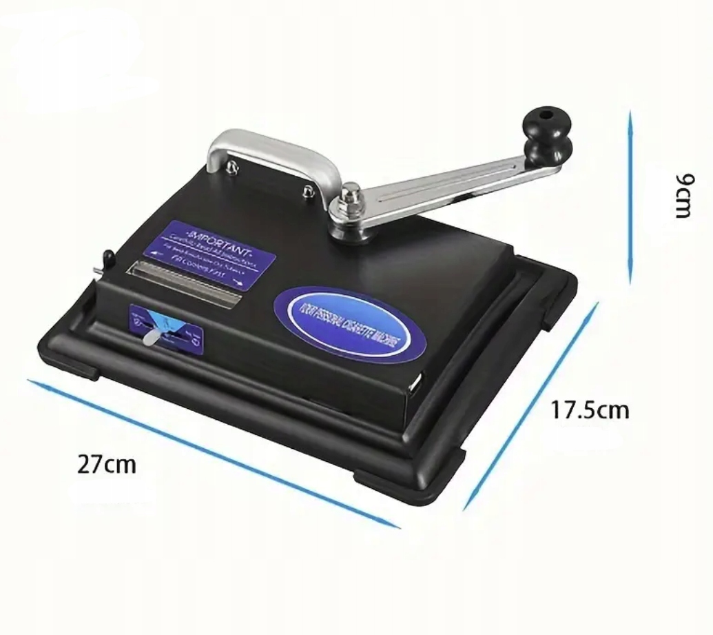 Profesjonalna maszynka do nabijania gilz. Precyzyjnie wykonana z solidnych materiałów. Bezawaryjna i łatwa w obsłudze. Instrukcja obsługi. 1. Nabijarkę stawiamy na równym podłożu, po czym trzymając za uchwyt, odpychamy rączkę od siebie żeby odsłonić wsyp do tytoniu. 2. Napełniamy wsyp tytoniem i nakładamy gilzę na nasadkę z lewej strony maszynki. 3. Po nałożeniu gilzy przesuwamy dźwignię do samego końca. 4. Po napełnieniu gilzy cofamy dźwignię i ostrożnie wyjmujemy gotowego papierosa. 5. Po skończonej pracy należy dokładnie wyczyścić maszynkę z resztek tytoniu.