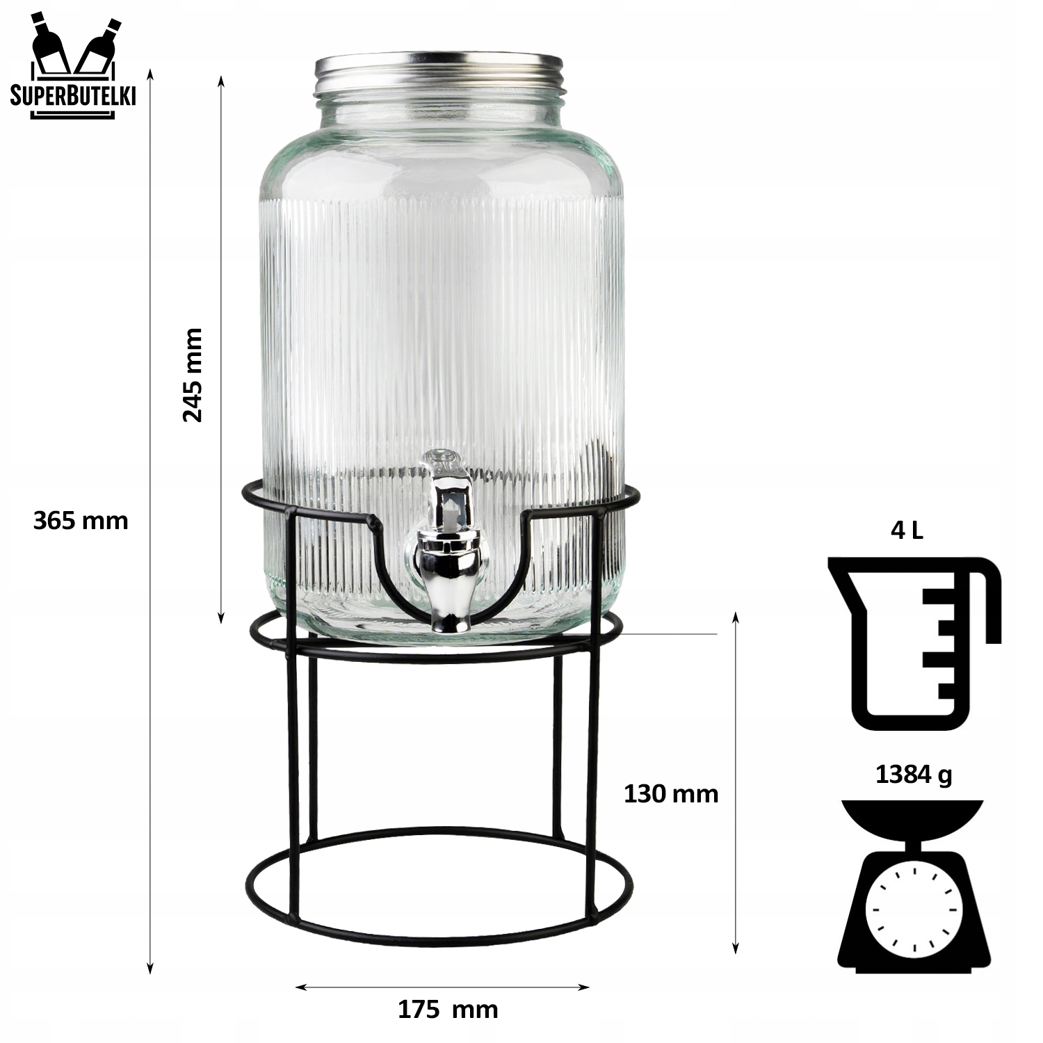 Szukasz idealnego sposobu na przechowywanie i serwowanie domowych napojów? Słoik 4L karbowany z metalową zakrętką i kranikiem na metalowym stojaku to idealny wybór! To połączenie eleganckiego designu z funkcjonalnością. Słoik jest idealny do serwowania nalewek, wody, mrożonej herbaty, sangrii, rumtopfu i wielu innych napojów.