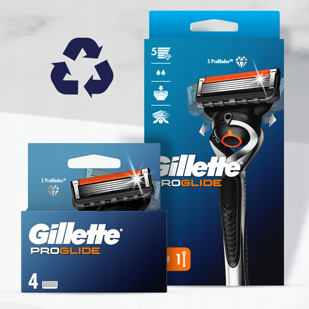Maszynka do golenia dla mężczyzn Gillette ProGlide łączy kultową precyzję golenia Gillette z komfortem i stylowym wyglądem. Ta maszynka do golenia dla mężczyzn jest wyposażona w większy pasek nawilżający* dla zapewnienia komfortu i poślizgu. Dodatkowy system stabilizacji ostrzy zapewnia optymalne rozmieszczenie ostrzy oraz większą kontrolę, by lepiej chronić skórę.