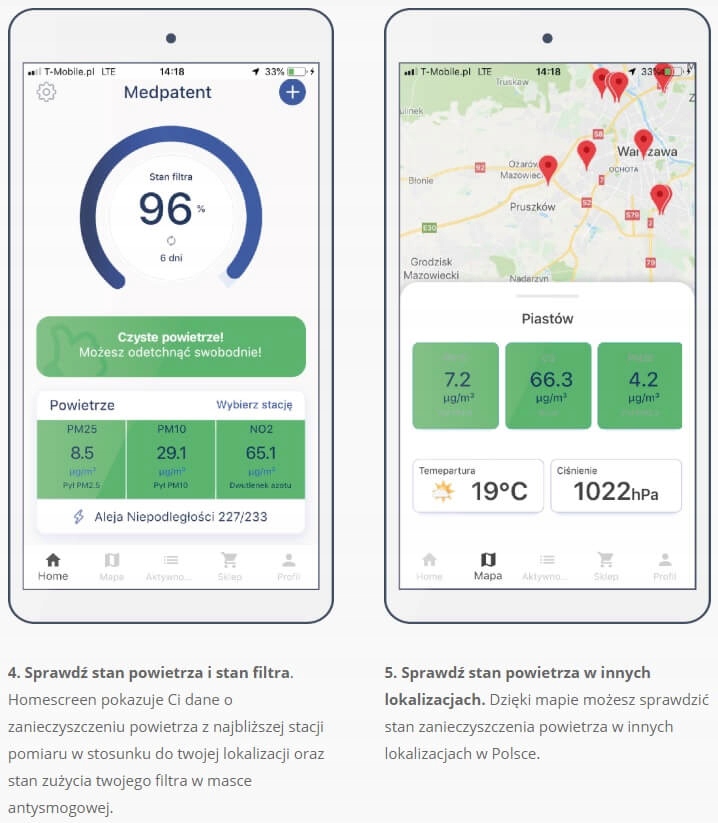 Aplikacja MEDPATENT pomoże monitorować stan zanieczyszczenia powietrza oraz zużycie filtra w masce antysmogowej. Funkcja monitorowania zużycia filtra w aplikacji jest kompatybilna wyłącznie z maskami antysmogowymi MEDPATENT Normal i Sport. Aplikacja korzysta z danych dostarczanych przez Główny Inspektorat Ochrony Środowiska (GIOŚ), które są aktualizowane co godzinę.