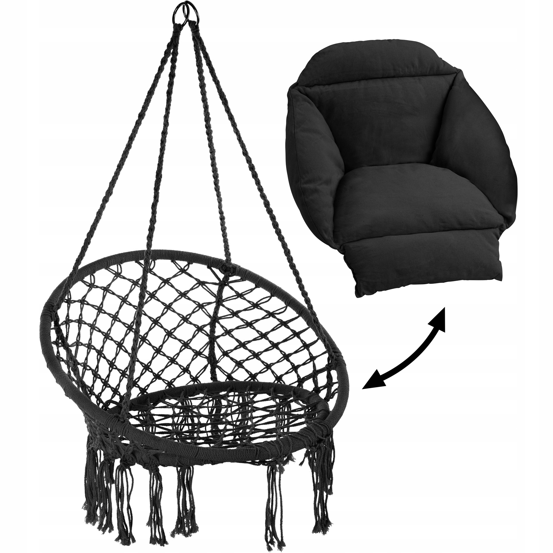 Duża, miękka poduszka podpiera ramiona, plecy i nogi, zapewniając idealną podstawę do relaksu. Cztery solidne liny przytrzymują konstrukcję ramy wykonanej z tkaniny i stali malowanej proszkowo, zapewniając bezpieczne i przyjemne unoszenie się w powietrzu.