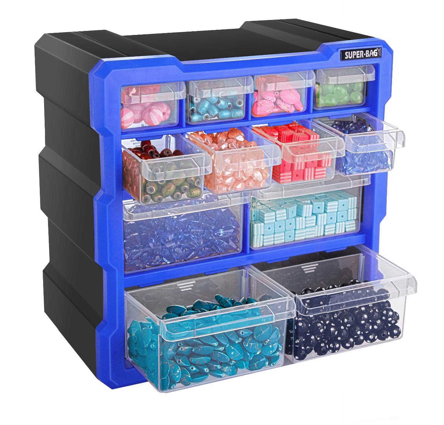 Organizer z transparentnymi szufladami, dzięki którym ich zawartość jest zawsze doskonale widoczna i łatwo dostępna.
