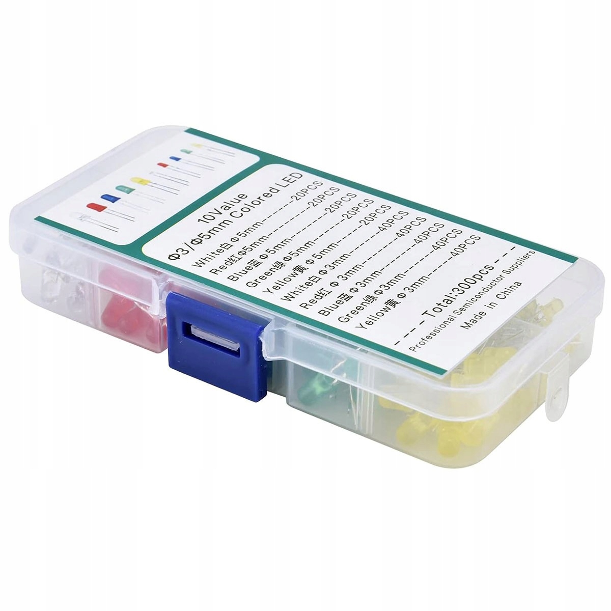 Duży zestaw diod LED zawierający aż 300 sztuk w pięciu popularnych kolorach: białym, czerwonym, zielonym, niebieskim i żółtym, dostępnych w dwóch rozmiarach – 3mm i 5mm. Zestaw zawiera szeroką gamę diod idealnych do projektów elektronicznych, hobbystycznych, a także do napraw i prototypowania.