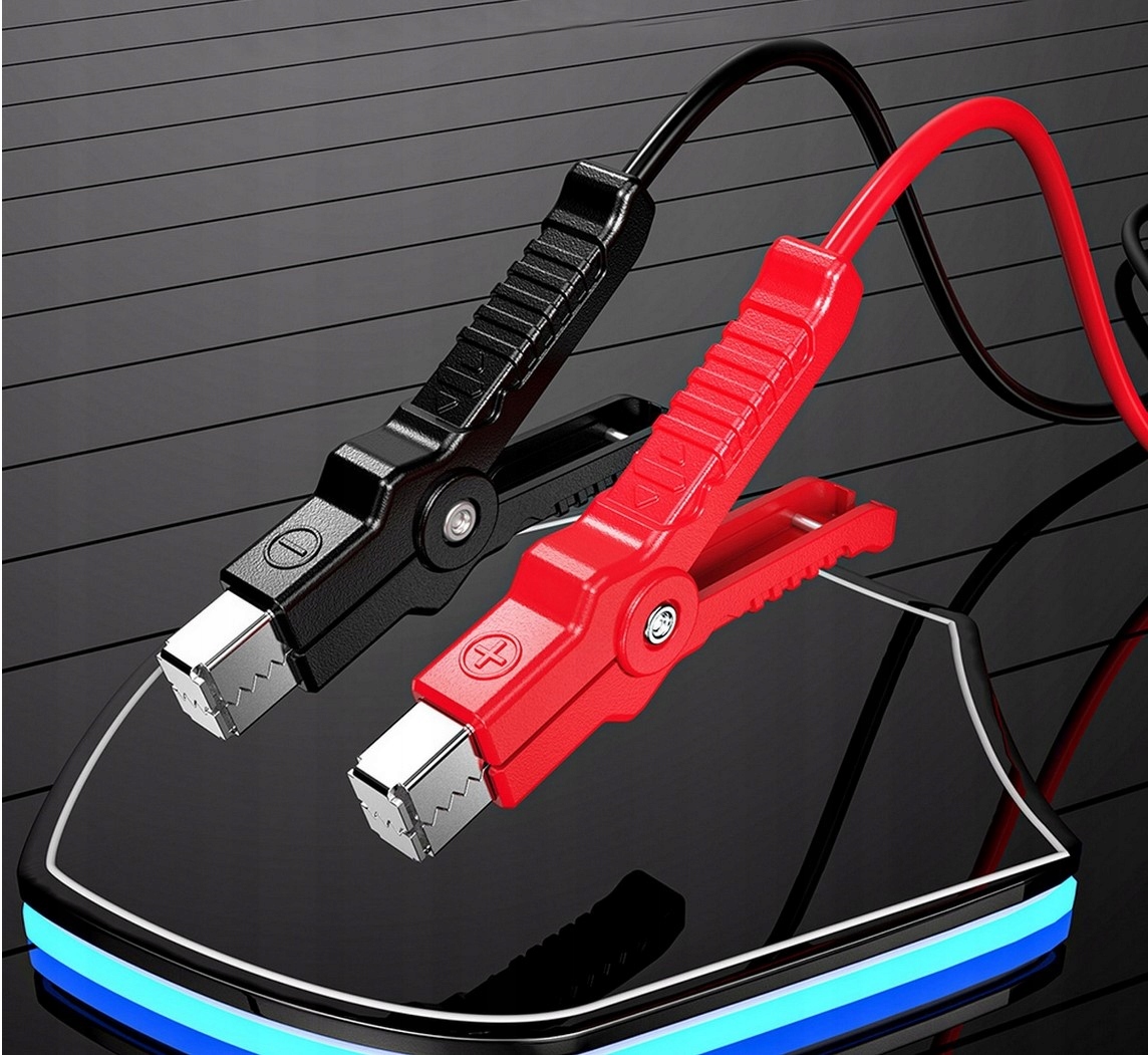Solidne klamry w kolorach czerwonym (+) i czarnym (-) zapewniają pewne i bezpieczne połączenie z akumulatorem, minimalizując ryzyko utraty kontaktu podczas testowania.
