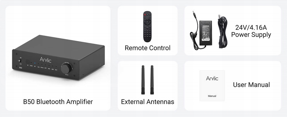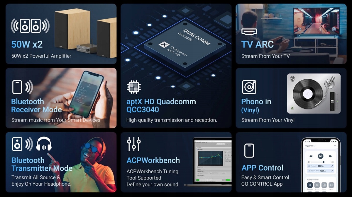 • Potężny wzmacniacz Bluetooth 50 W x 2 do głośników pasywnych, głośników półkowych i urządzeń mobilnych.