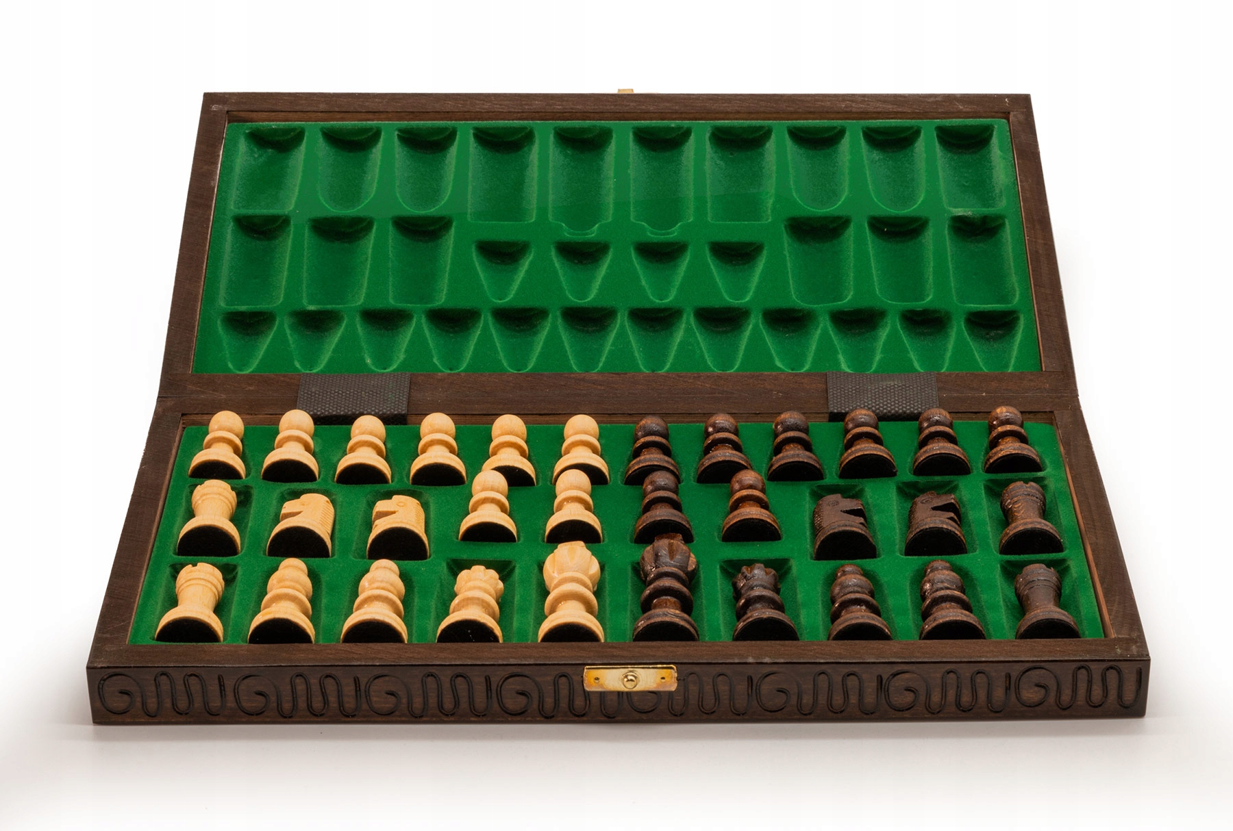 Komplet stanowi kaseta z planszą szachową, zestaw figur szachowych w kolorach białym i brązowym po 16 elementów w każdym.
