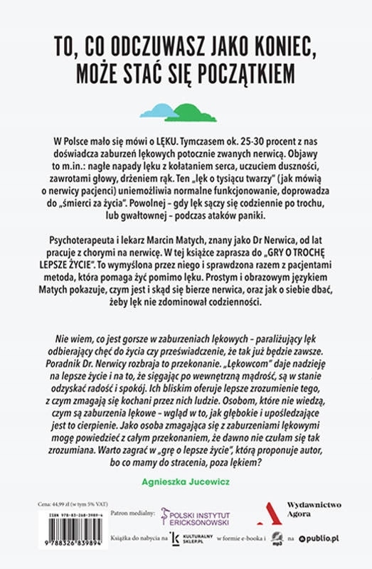 Nie wiem co jest gorsze w zaburzeniach lękowych- paraliżujący lęk często odbierający chęć do życia czy przeświadczenie, że tak już będzie zawsze i nic się nie zmieni? Poradnik Marcina Matycha rozbraja to przekonanie na wiele sposobów. "Lękowcom" daje nadzieję, że lepsze życie jest możliwe i że sięgając po wewnętrzną mądrość, są w stanie odzyskać radość i spokój. Ich bliskim oferuje lepsze zrozumienie tego, z czym zmagają się kochani przez nich ludzie, a także narzędzia, które pozwalają ich lepiej wspierać. Osobom, które nie wiedzą czym są zaburzenia lękowe, a niekiedy je wręcz bagatelizują - wgląd w to, jak głębokie i upośledzające jest to cierpienie.