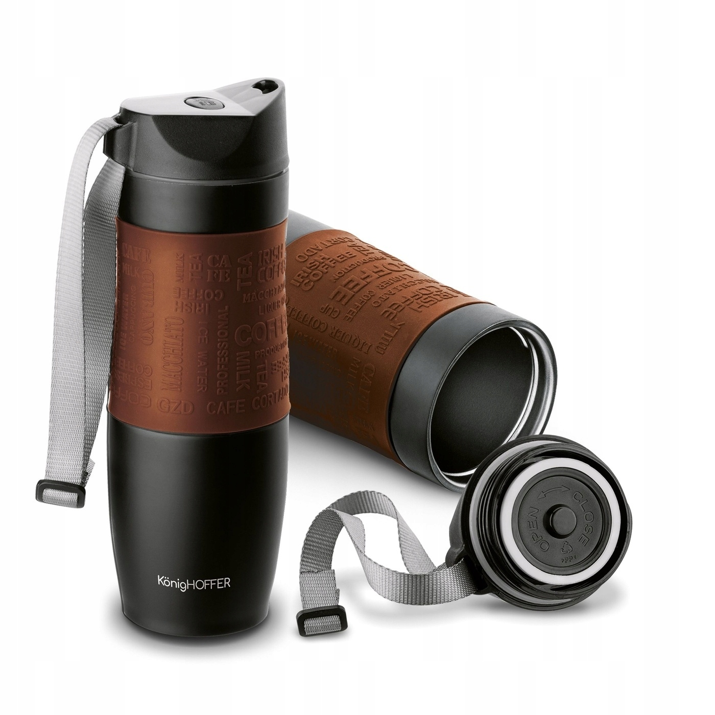 Brązowy kubek termiczny Konighoffer Frizo 480 ml wykonany jest ze stali nierdzewnej. Podwójne ścianki i próżnia dobrze chronią zawartość przed utratą temperatury. Model nadaje się do zimnych i gorących napojów. Smukły kształt korpusu i częściowe wykończenie go silikonem umożliwia pewny chwyt. Produkt chroni dodatkowo przed oparzeniem dłoni w trakcie picia kawy lub herbaty. Zamknięcie click-clack kubka jest szczelne i ma profilowany ustnik. Obsłużysz go jedną ręką. Mechanizm rozszczelniający uchroni cię przed otwarciem np. w plecaku. Łatwo go umyjesz. Dzięki materiałowemu paskowi wygodniej przymocujesz model na zewnątrz bagażu. Możesz podarować taki kubek próżniowy osobie aktywnej.