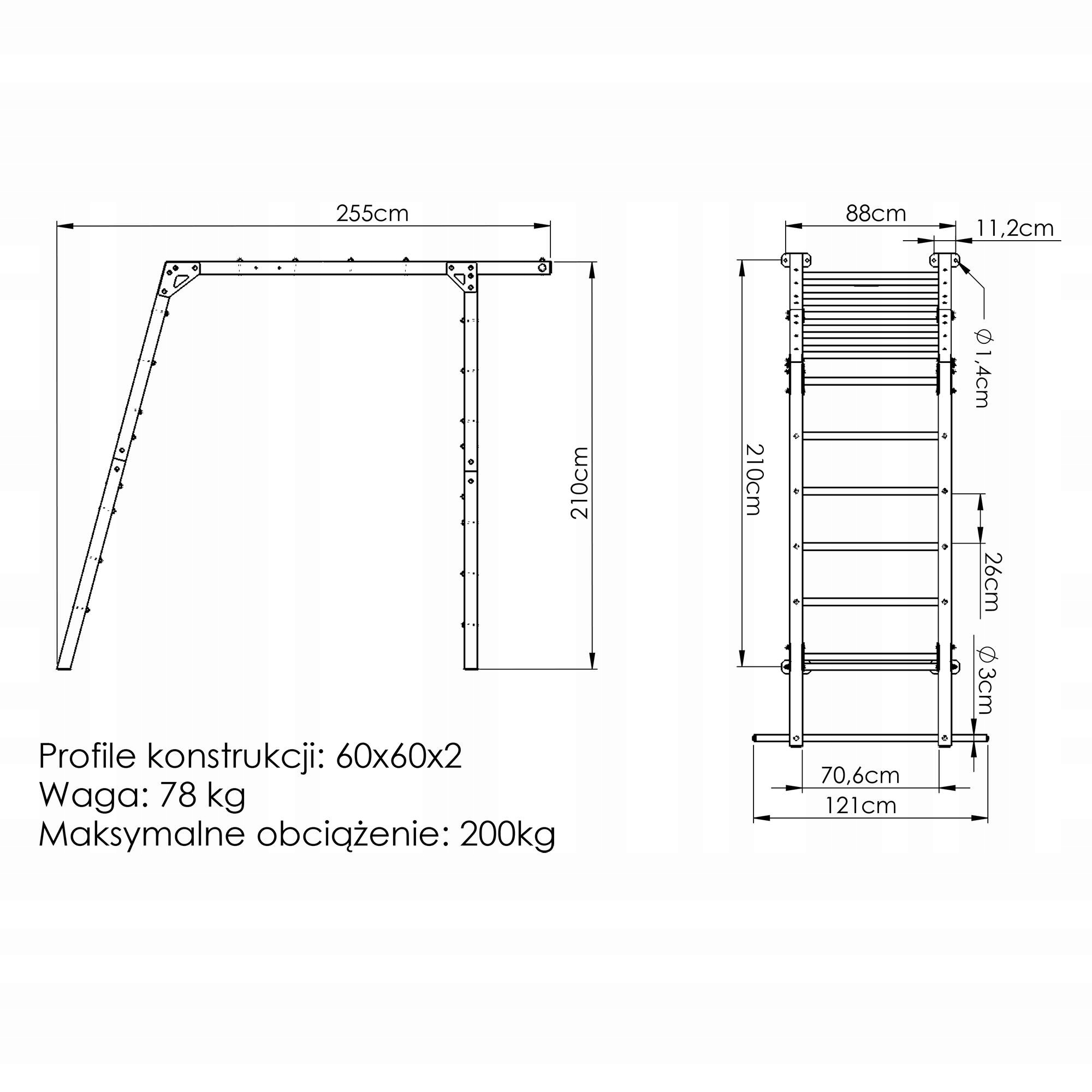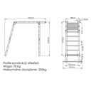 Rama drabinki gimnastycznej MO-016 jest zbudowana z wytrzymałych profili konstrukcyjnych o przekroju 60x60x2 mm. Miejsca łączeń zostały dodatkowo wzmocnione metalowymi narożnikami, co przekłada się na wysoką stabilność i wytrzymałość całej konstrukcji, której maksymalne obciążenie to nawet 200 kg!