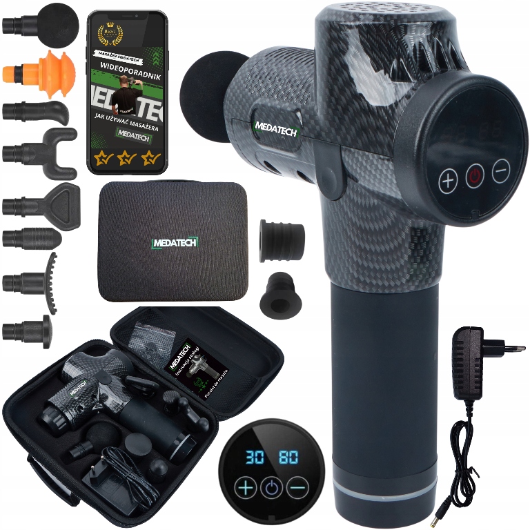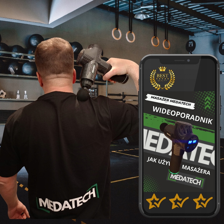 Poznaj pistolet do masażu MEDATECH M02– Twój osobisty, wielofunkcyjny pistolet na największą liczbą końcówek, idealny do rozluźniania i regeneracji napięć mięśniowych. Niezależnie od tego, czy jesteś sportowcem, seniorem lub pracujesz przy biurku, czy po prostu potrzebujesz chwili relaksu – to uniwersalne urządzenie jest stworzone dla Każdego. Tylko u Nas do dyspozycji jest osiem wybranych przez profesjonalnego fizjoterapeutę końcówek, które umożliwiają bezpieczny, komfortowy i skuteczny masaż dowolnej części ciała, zarówno większych partii, jak i pojedynczych punktów mięśniowych.