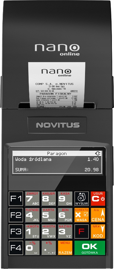 Przedmiotem oferty jest kasa fiskalna Novitus NANO Online wraz z adapterem WiFi TP-Link WN725N umożliwiającym podłączenie urządzenia do sieci lokalnej przez WiFi.oraz z pakietem usług instalacyjnych /oprogramowanie konfiguracyjne kasy, zaprogramowanie bazy towarowej, fiskalizację urządzenia/ dzięki któremu kasa jest gotowa do rejestracji sprzedaży i wystawiania paragonów sprzedaży.