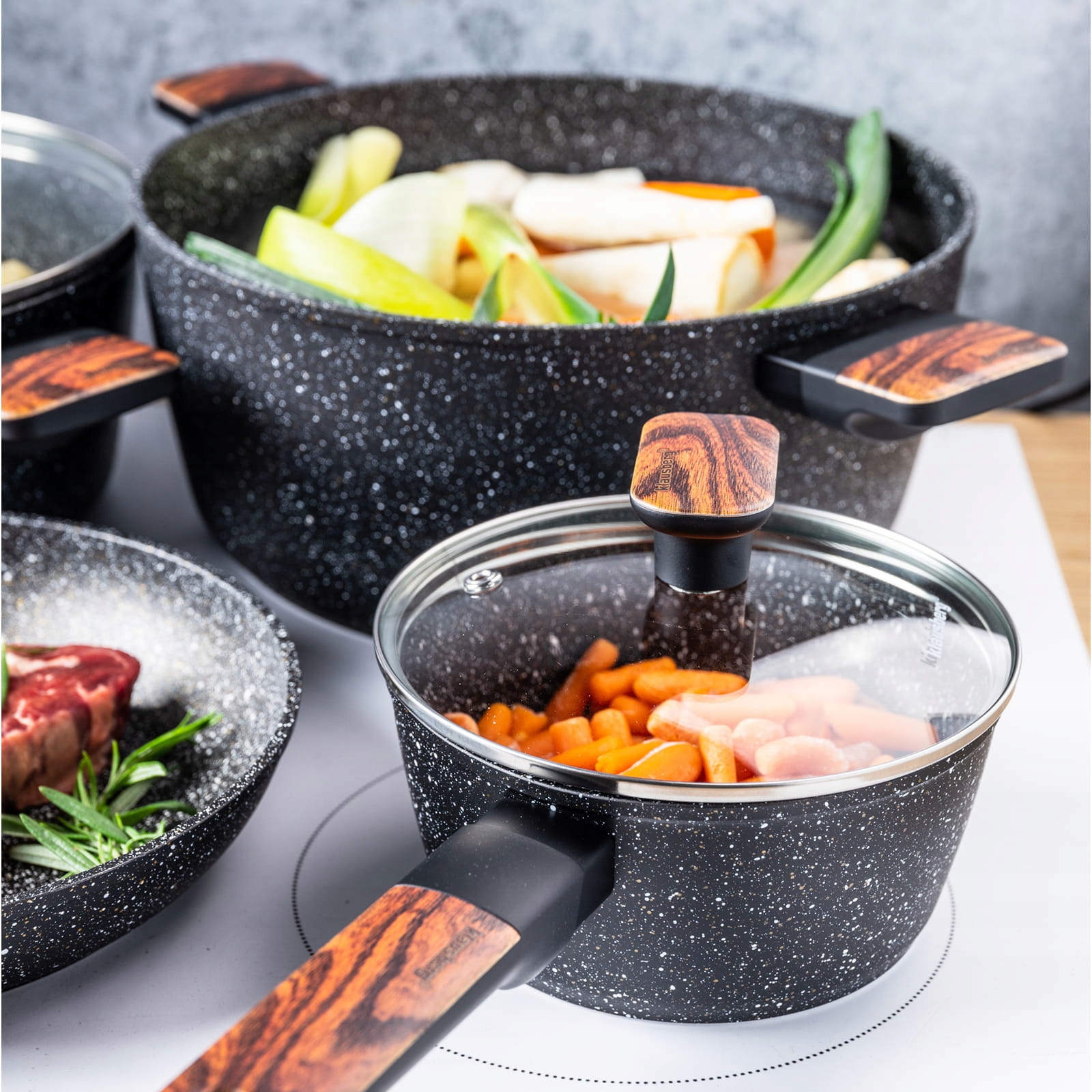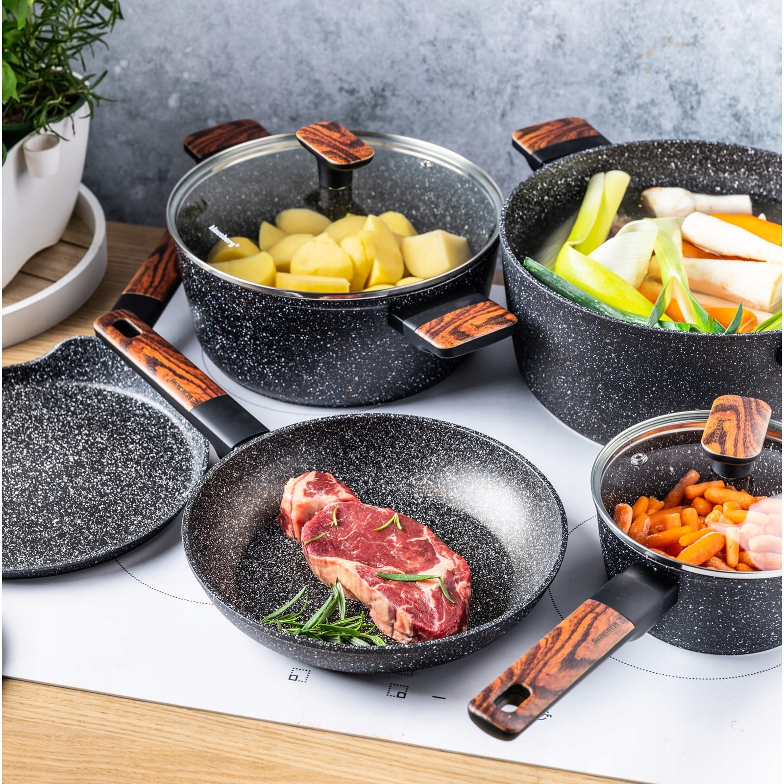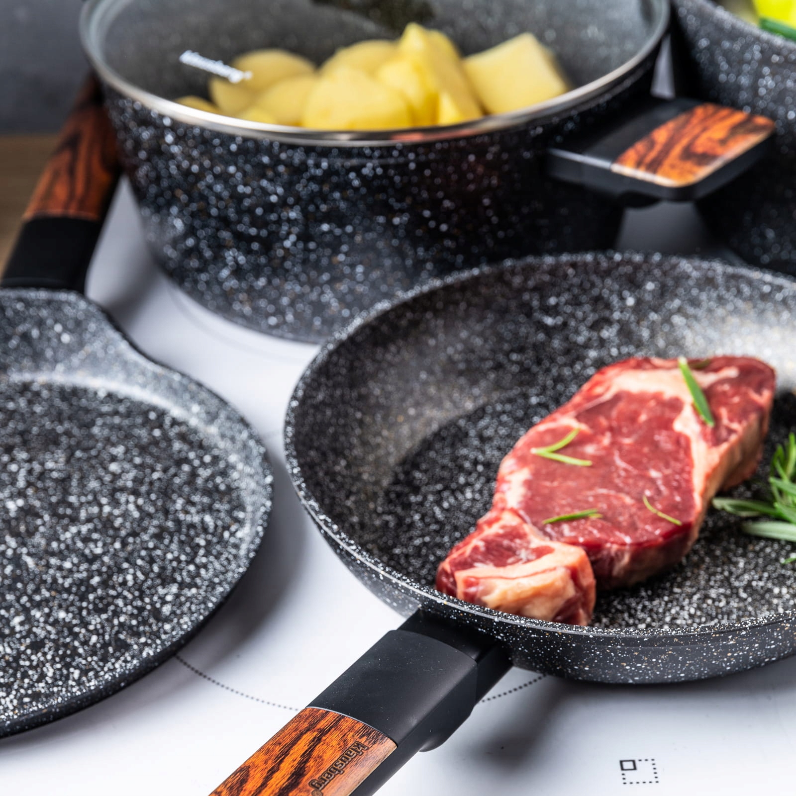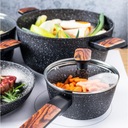 Marmurkowa powłoka sprawia, że naczynia są wyjątkowo odporne na wszelkie zarysowania i trwałe. Ten typ garnków i patelni pozwala również na smażenie przy użyciu minimalnej ilości tłuszczu, ponieważ naczynie rozgrzewa się podobnie do kamienia i oddaje ciepło całą swą powierzchnią.