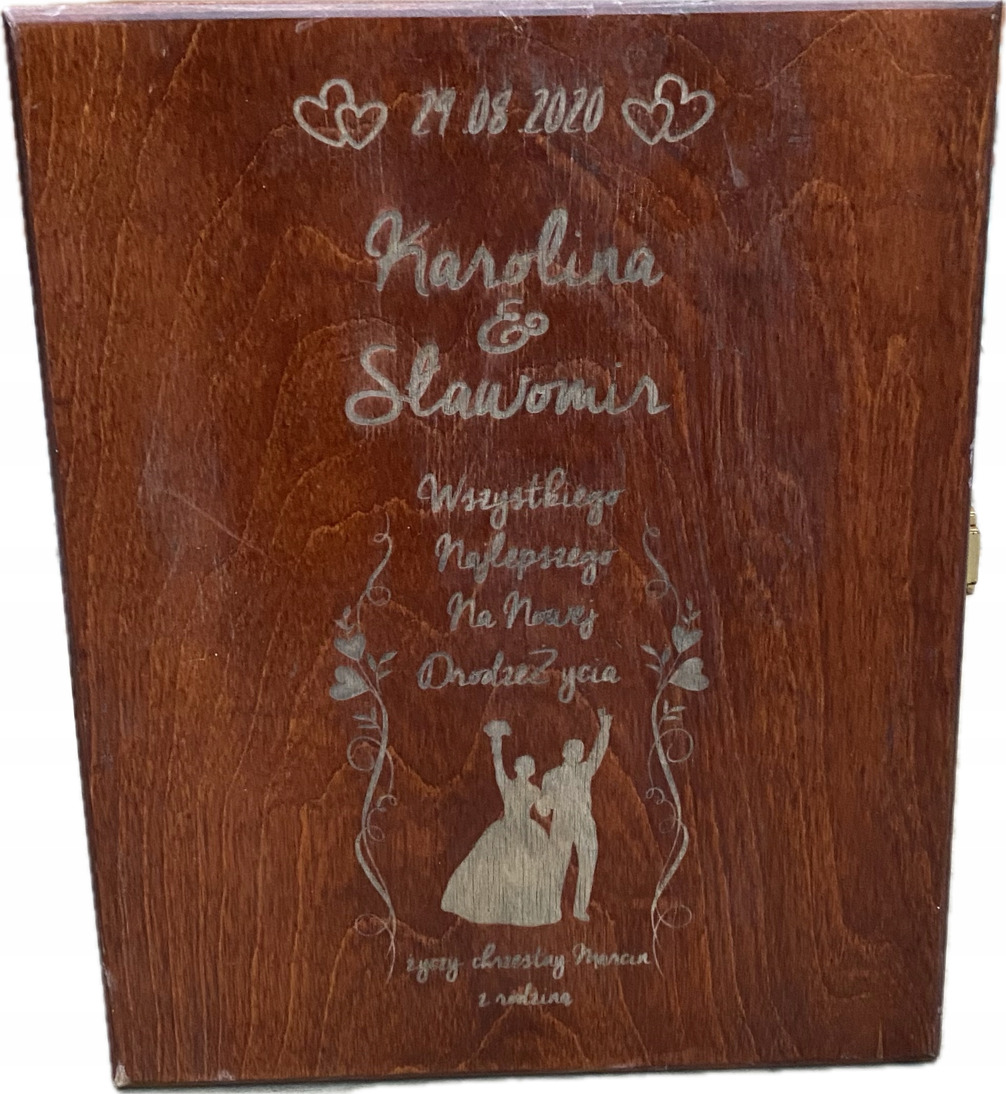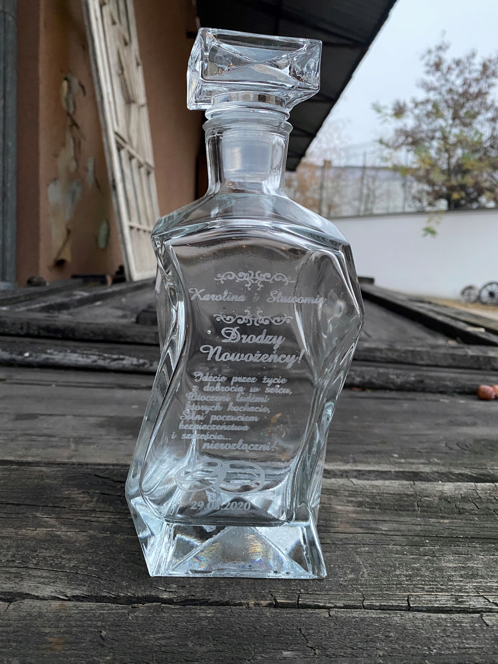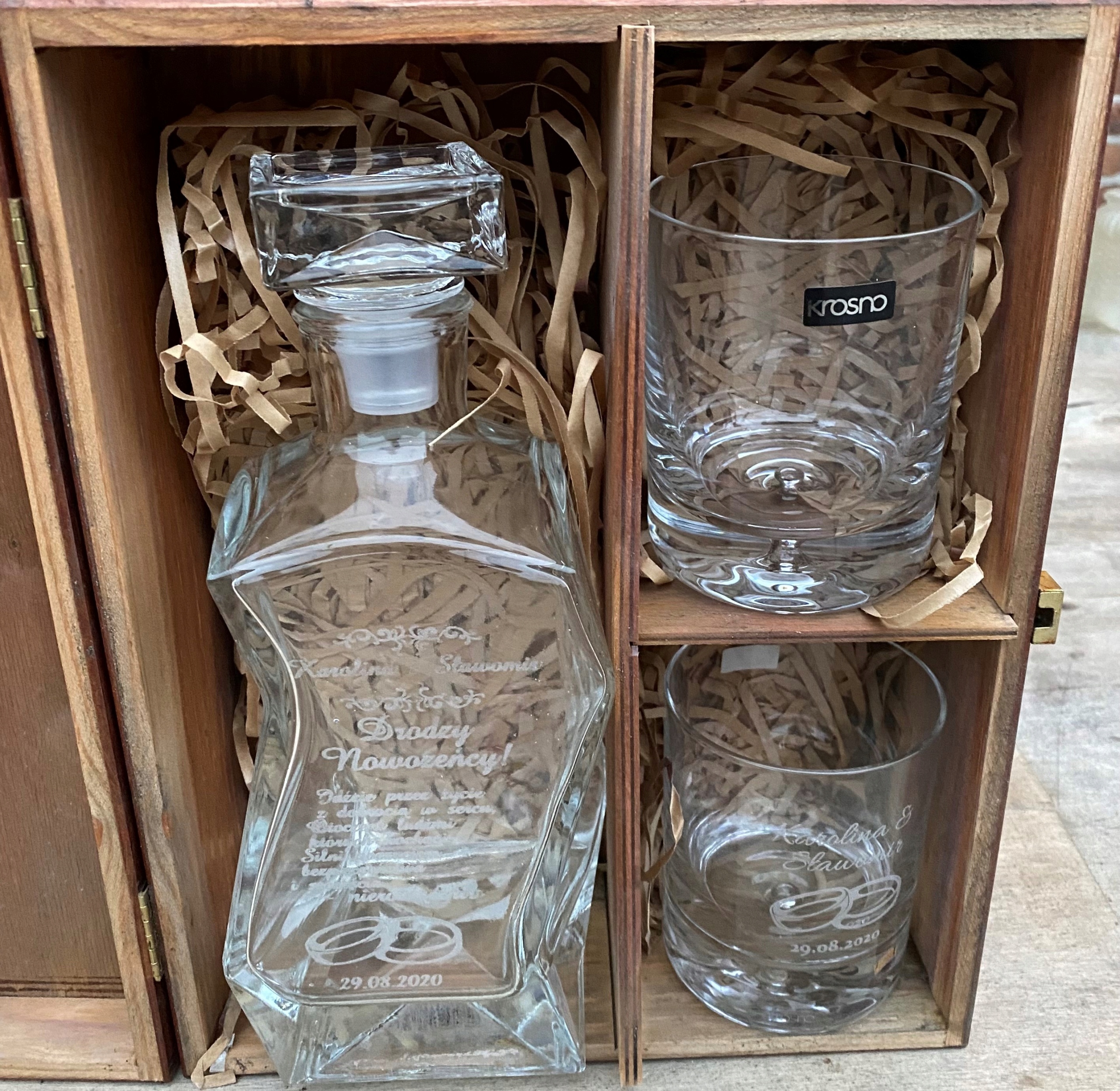 Zestaw karafka plus 2 szklanki w etui drewnianym z dedykacją ślubną z 2020 roku. Huta szkła Krosno. Polecam