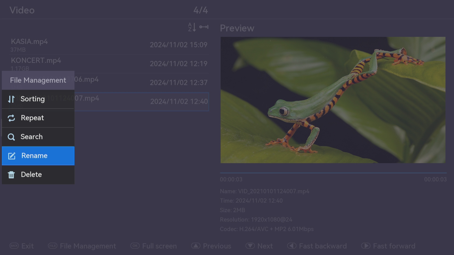 Wciśnięcie przycisku Video, Image lub Audio na pilocie wywołuje odpowiednio listę nagranych filmów zdjęć i nagrań dźwiękowych - gotowych do bezpośredniego odtwarzania.