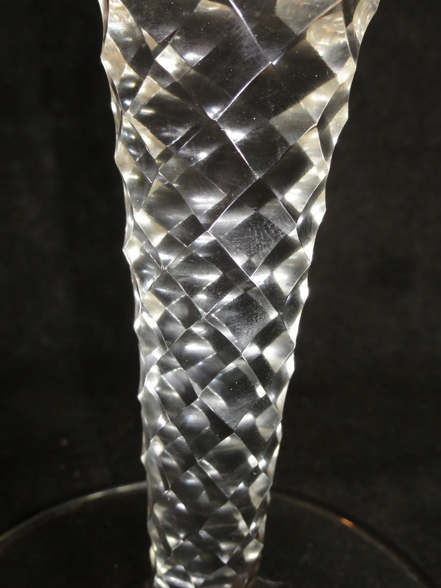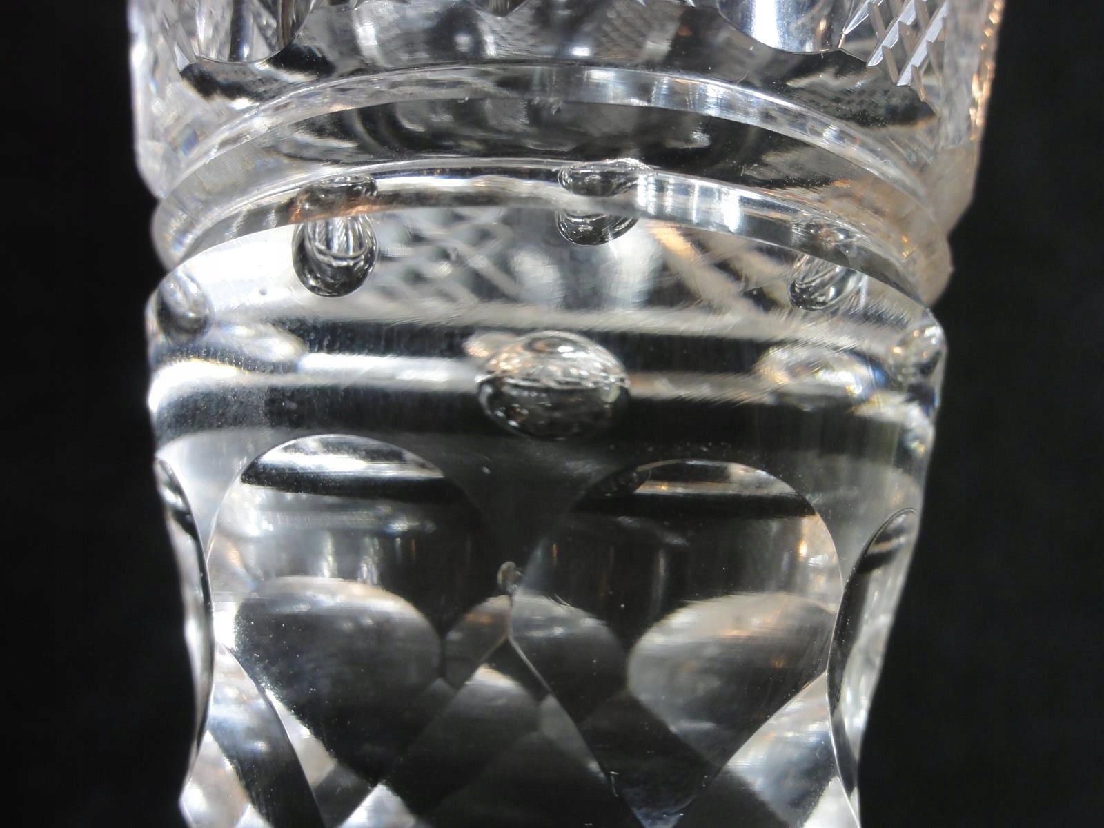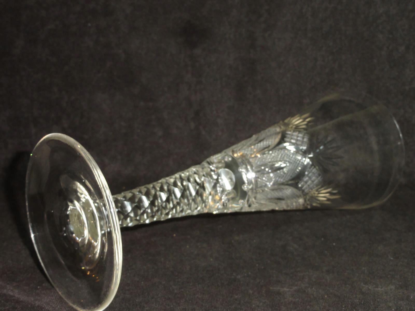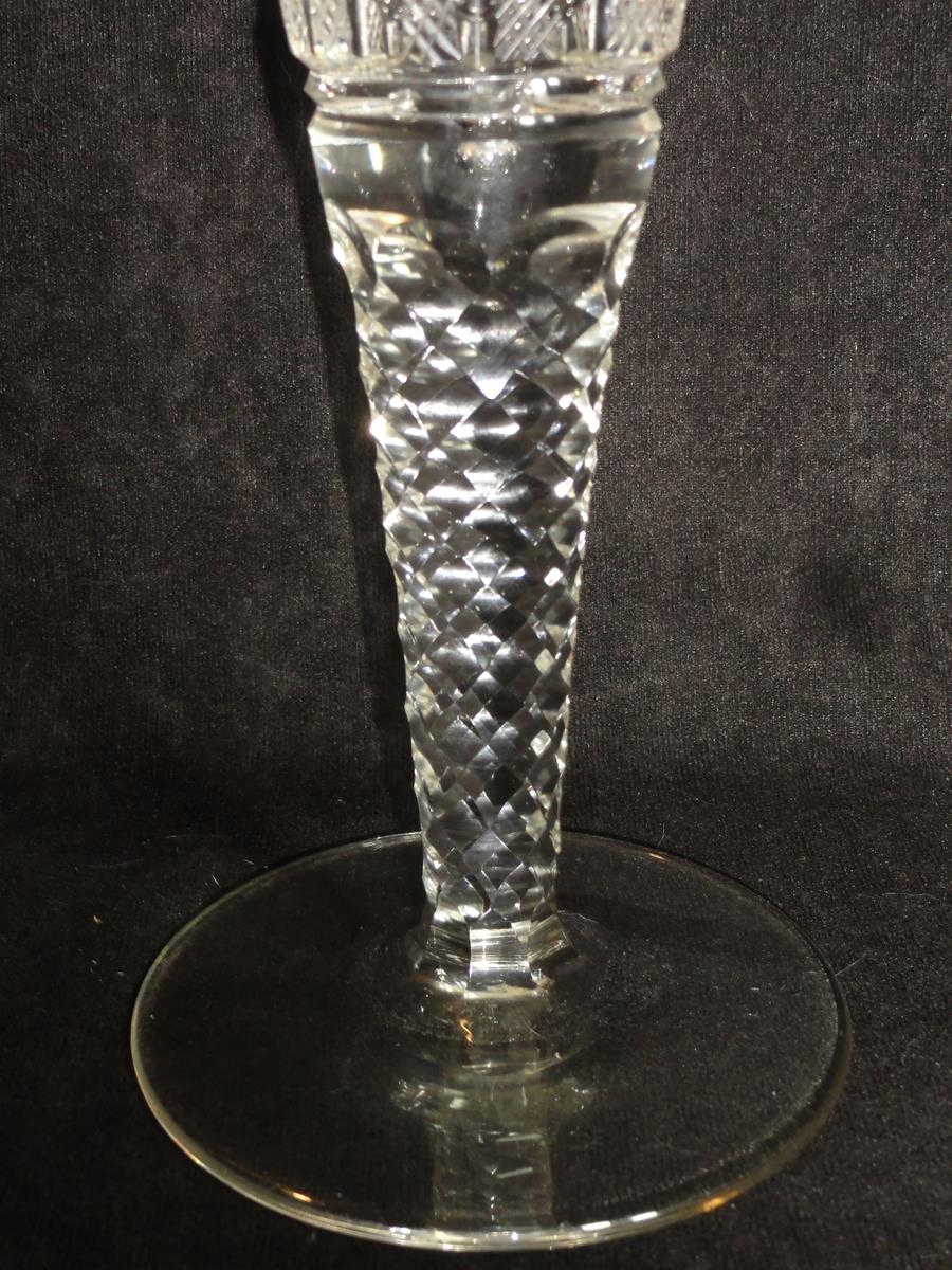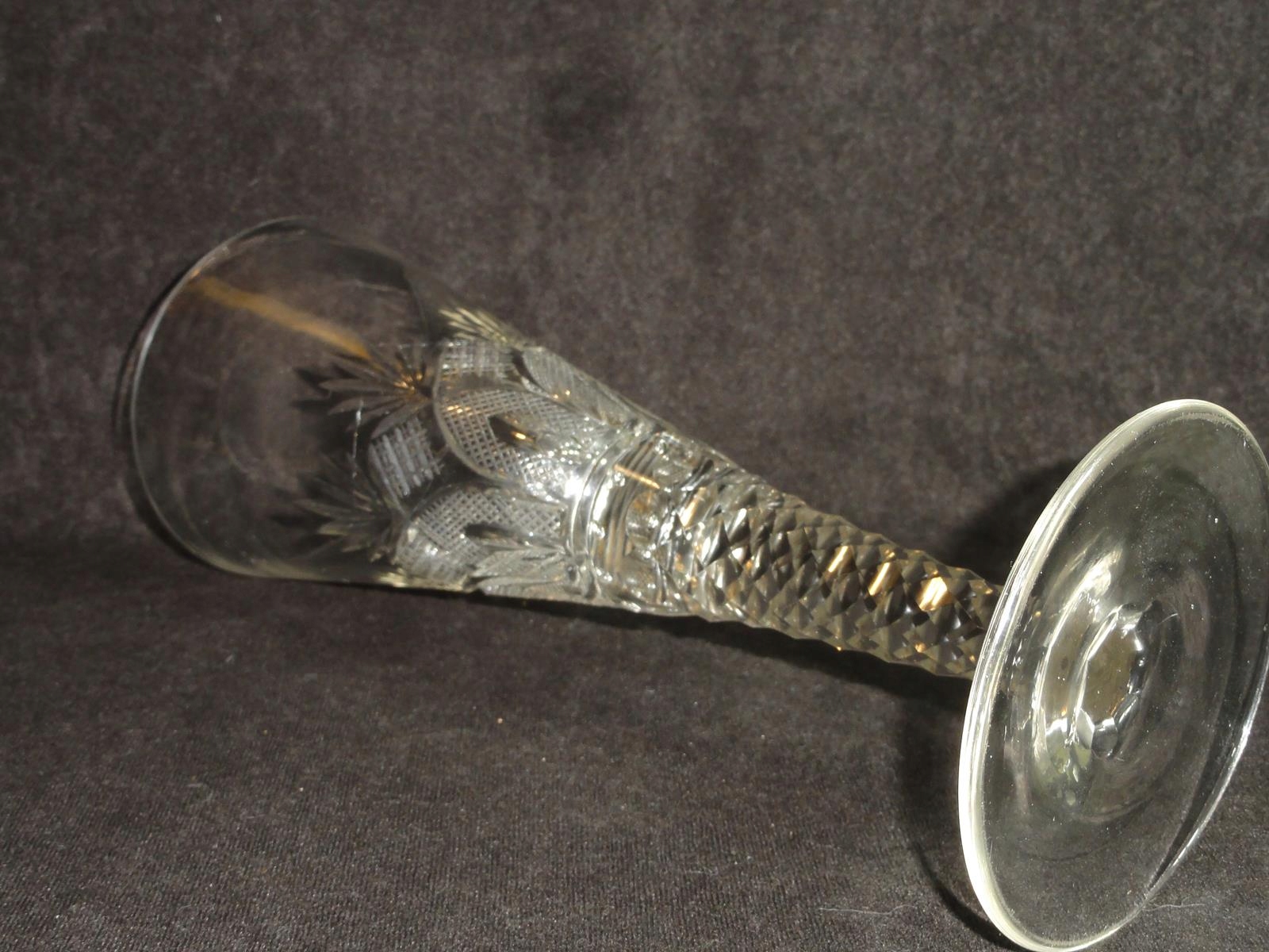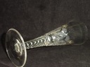 *kielich wykonany ze szkła bezbarwnego, dmuchany w formie, koniczny trzon z brylantowym szlifem, czara z 9 pęcherzami powietrza u nasady, na brzuścu precyzyjnie szlifowany,