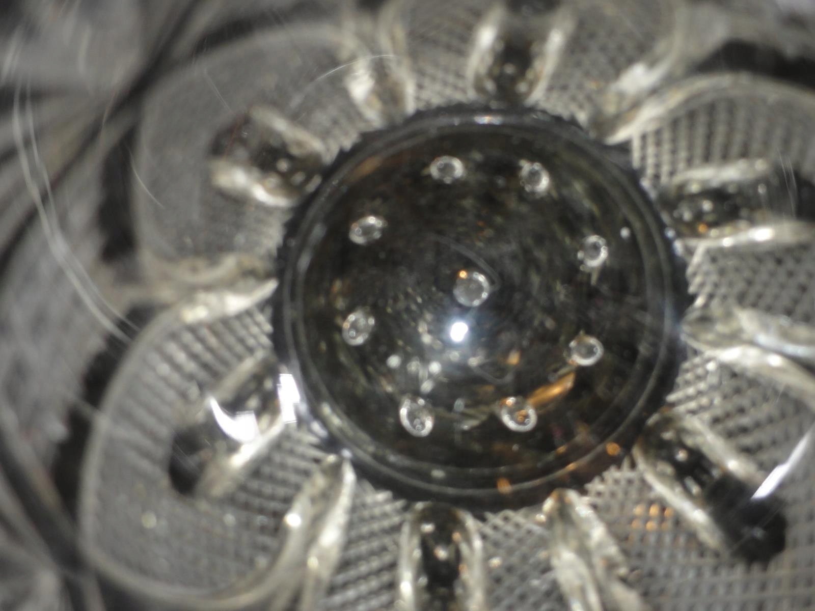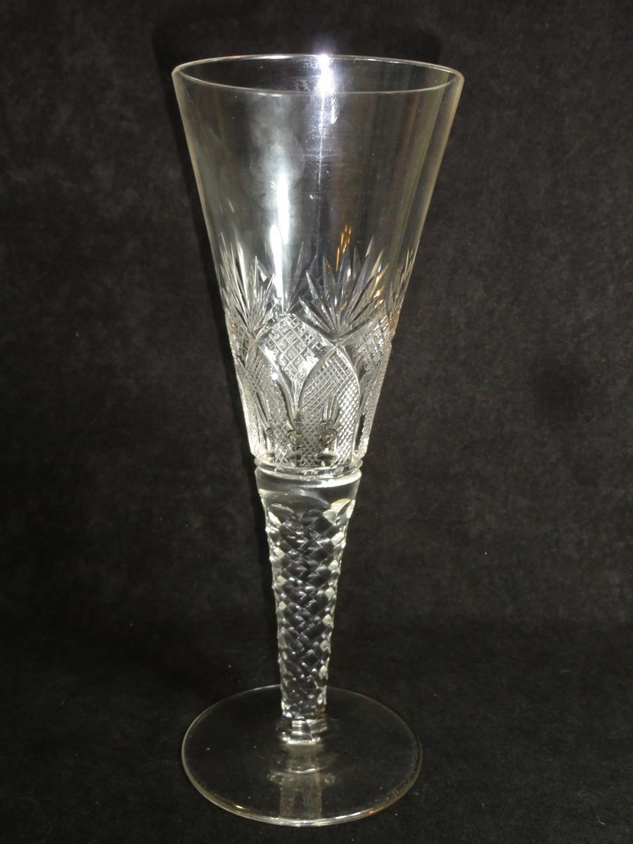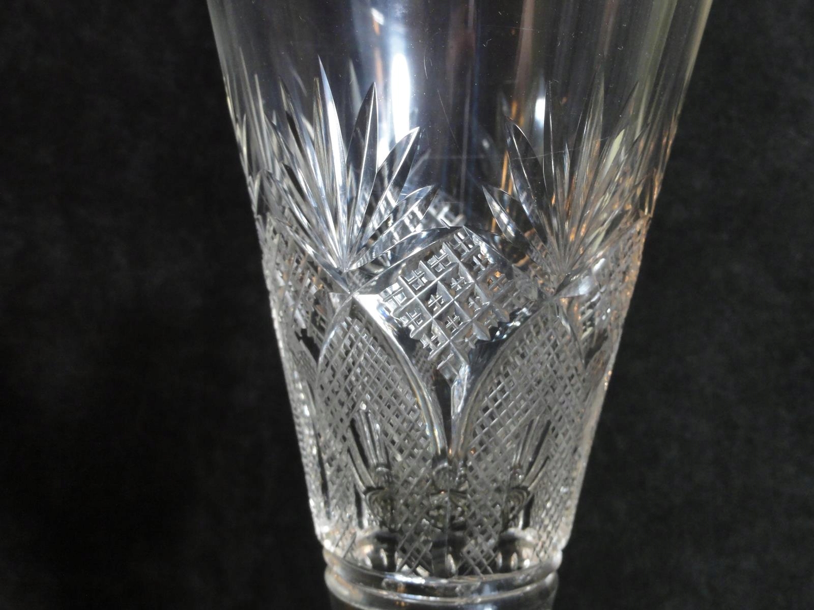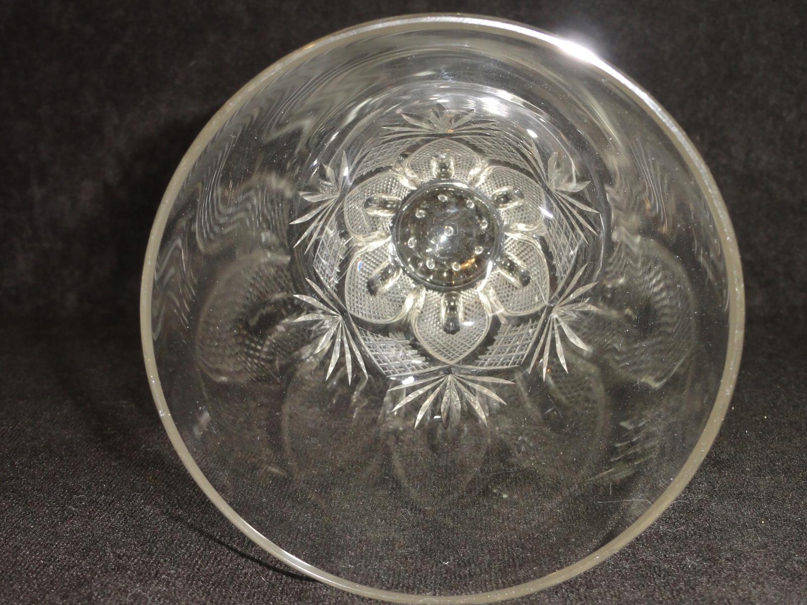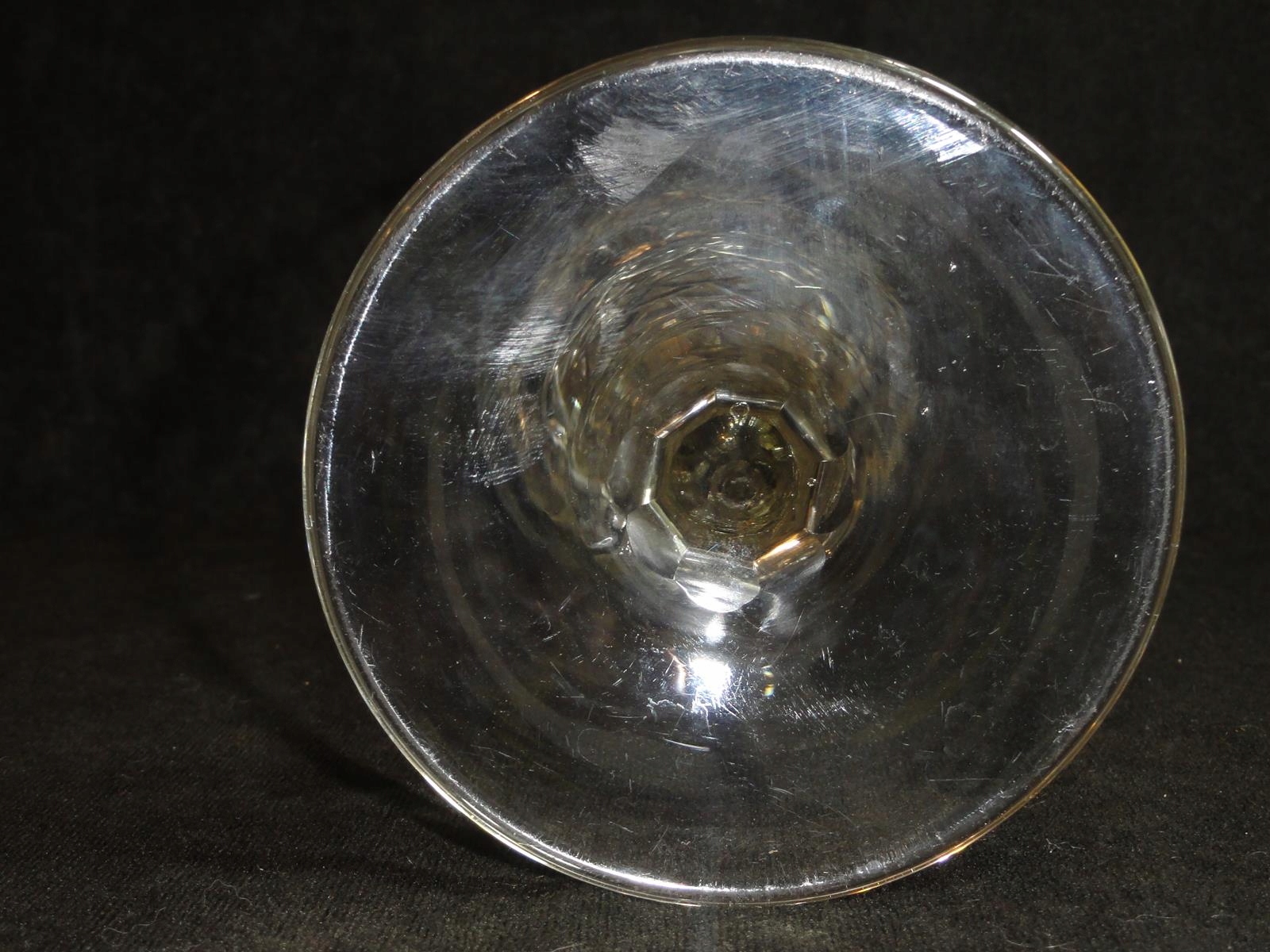 *kielich wykonany ze szkła bezbarwnego, dmuchany w formie, koniczny trzon z brylantowym szlifem, czara z 9 pęcherzami powietrza u nasady, na brzuścu precyzyjnie szlifowany,