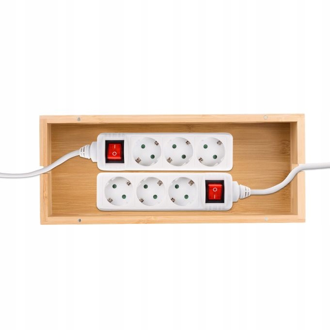 Dzięki praktycznemu pojemnikowi kablowemu wykonanemu z bambusa możesz położyć kres bałaganowi kabli w kąciku telewizyjnym lub na biurku. Skrzynka oferuje miejsce na 2 rozdzielnice i pozwala zniknąć kable od telewizorów, konsol do gier, laptopów czy smartfonów. Dzięki wielu otworom kablowym można łatwo uporządkować wiązki kabli. Małe urządzenia można podczas ładowania umieścić bezpośrednio na półce organizera na kable.
