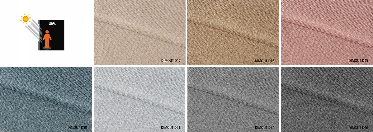 DIMOUT - tkanina zaciemniająca w 80%. Idealnie nadaje się do sypialni lub pomieszczeń bardzo nasłonecznionych. Sztywna o wyrazistej strukturze, niemal organicznym wyglądzie. Tył tkaniny gładki, jednokolorowy.