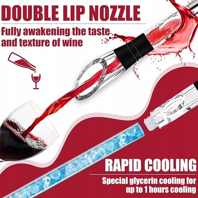 【Szybkie chłodzenie】 Różdżka chłodząca wino 7 w 1, połączenie wbudowanej chłodziarki do butelek wina i nalewaka do wina, pozwala cieszyć się idealnie schłodzonym kieliszkiem do wina w optymalnej temperaturze. Nasz sztyft chłodzący do wina z nalewakiem zawiera specjalną glicerynę, zapewnia, że wino pozostaje świeże przed nalaniem ostatniej kropli, w pełni budząc świeżość wina i doświadczając ostatecznego smaku wina.