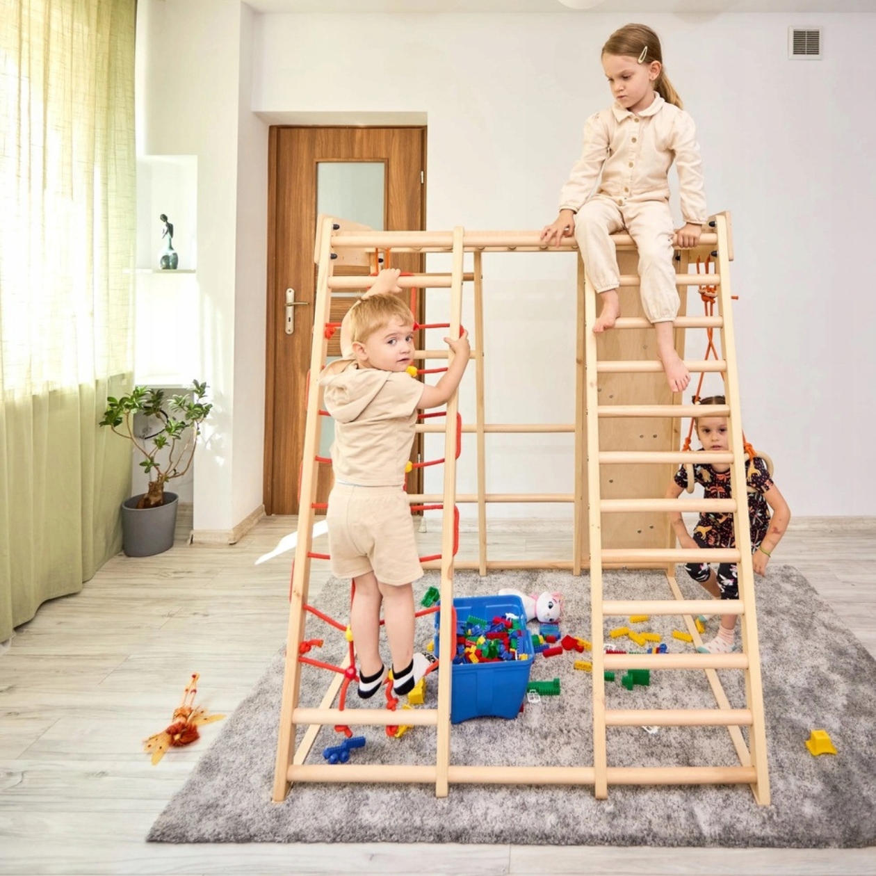 Dzięki kompaktowej konstrukcji, plac zabaw można ustawić w pokoju dziecięcym, bawialni lub na tarasie, co umożliwia aktywną zabawę nawet w zimowe i deszczowe dni.