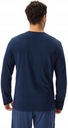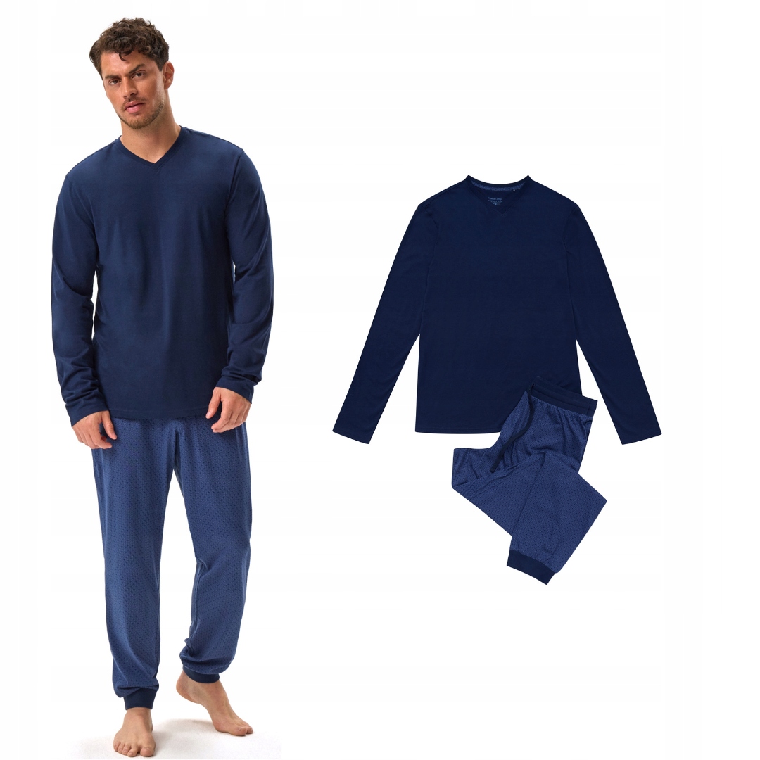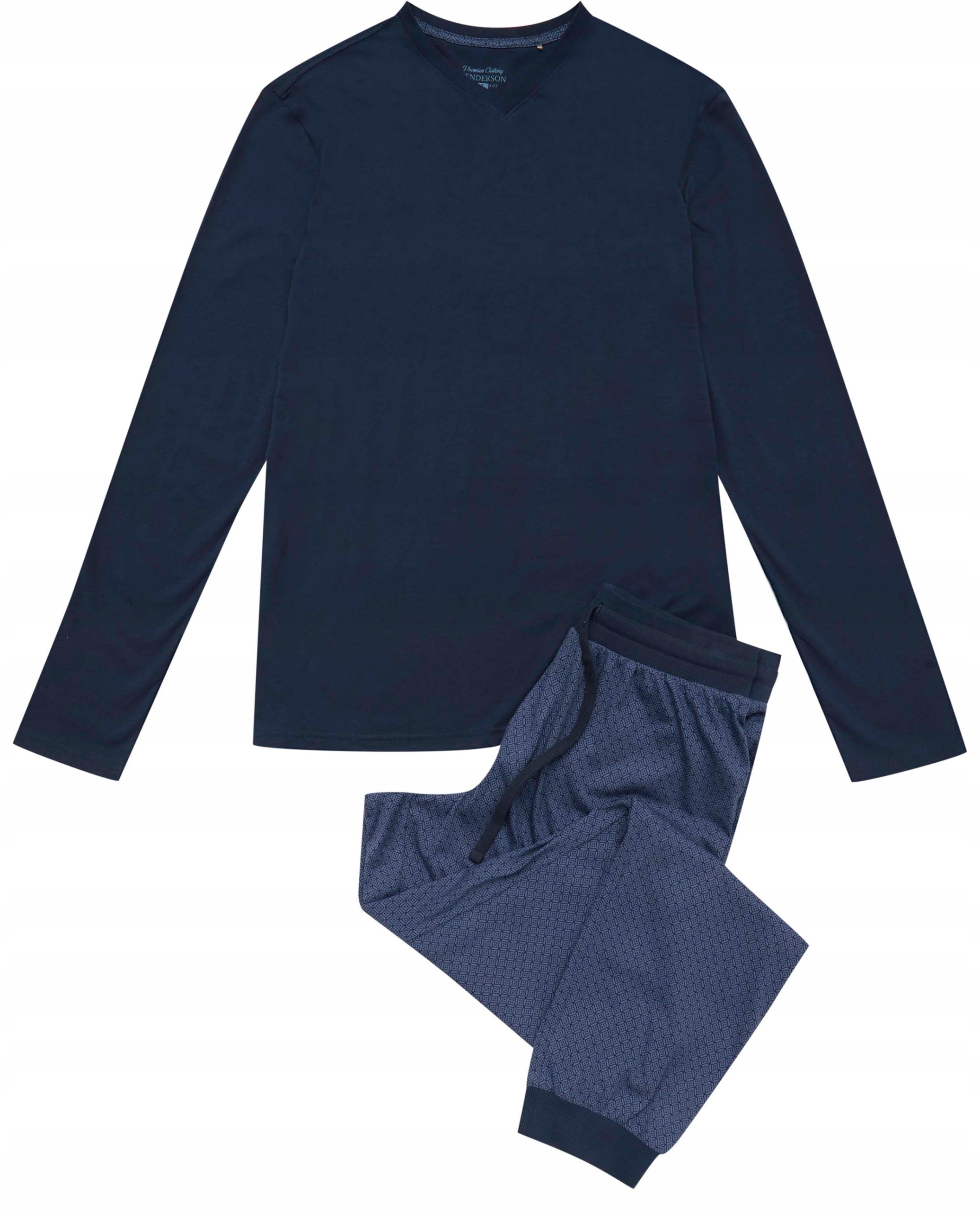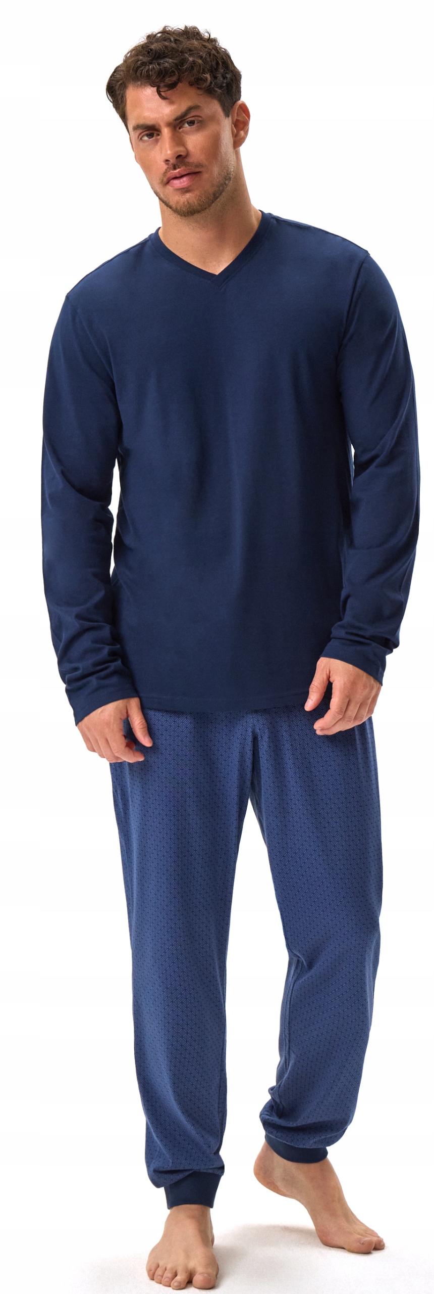 Hunt to męska piżama z długimi nogawkami i rękawami, idealna na chłodniejsze noce. Na pewno docenisz jej naturalny, przyjemny w dotyku, oddychający materiał – dzianinę bawełnianą. Piżama nie zawiera sztucznych domieszek, a mimo to jest elastyczna i dobrze dopasowuje się do figury. To model w uniwersalnym granatowym kolorze, z czarnymi detalami.