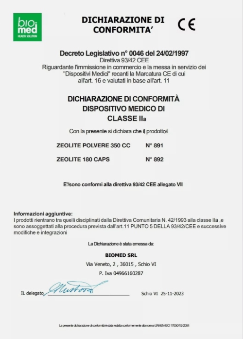 OSTRZEŻENIA I ŚRODKI OSTROŻNOŚCI: Po zażyciu należy zachować przynajmniej 2-godzinny odstęp przed zażyciem innych substancji i/lub leków: wchłanianie wywołane przez zeolit może bowiem wpłynąć na ich skuteczność. Nie stosować jednocześnie z napojami alkoholowymi, zawierającymi kofeiną i kwasy, takimi jak sok grejpfrutowy, pomarańczowy, cytrynowy i ananasowy. Po 28 dniach należy przerwać przyjmowanie zeolitu na co najmniej tydzień. Produkt należy przechowywać poza zasięgiem dzieci. Nie stosować produktu, jeśli minął termin ważności podany na opakowaniu.